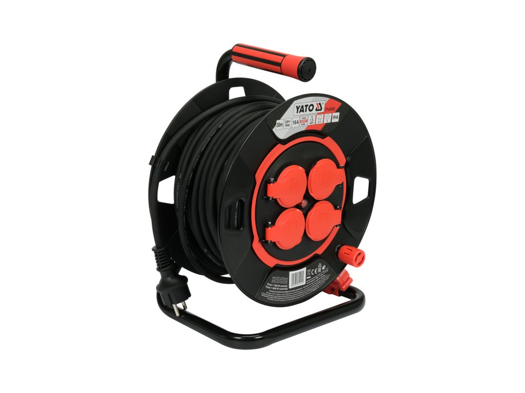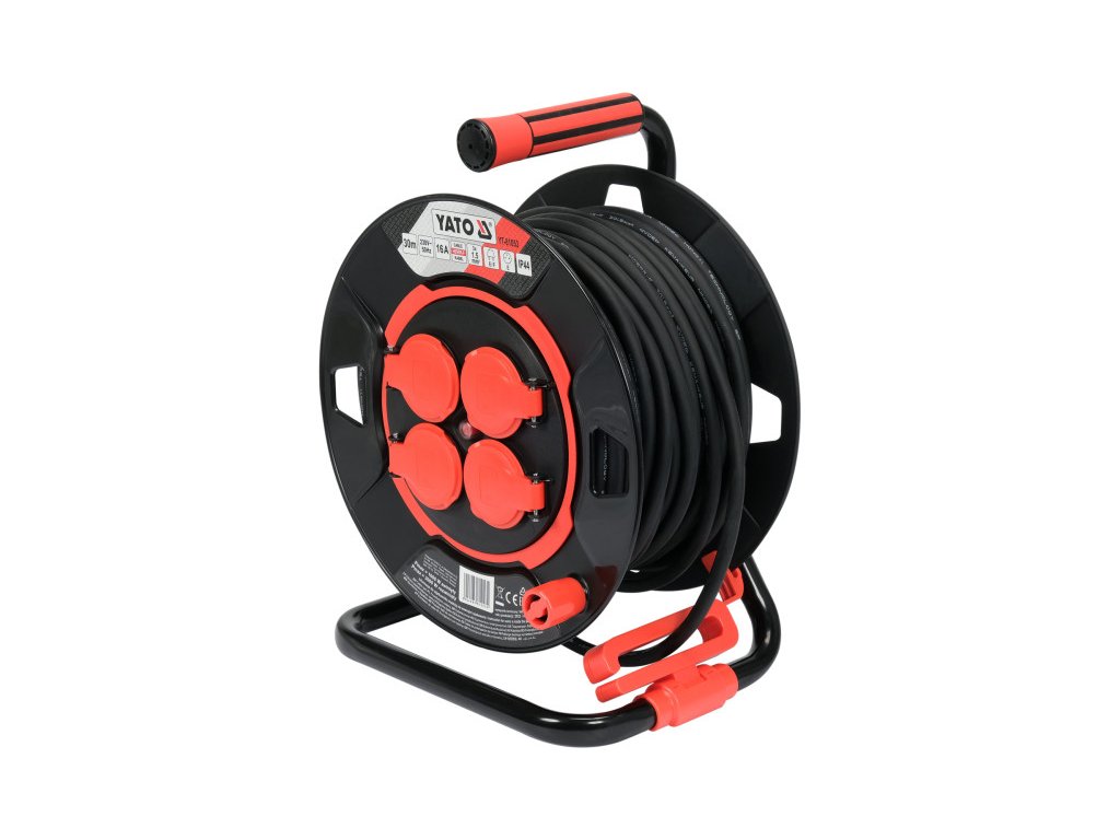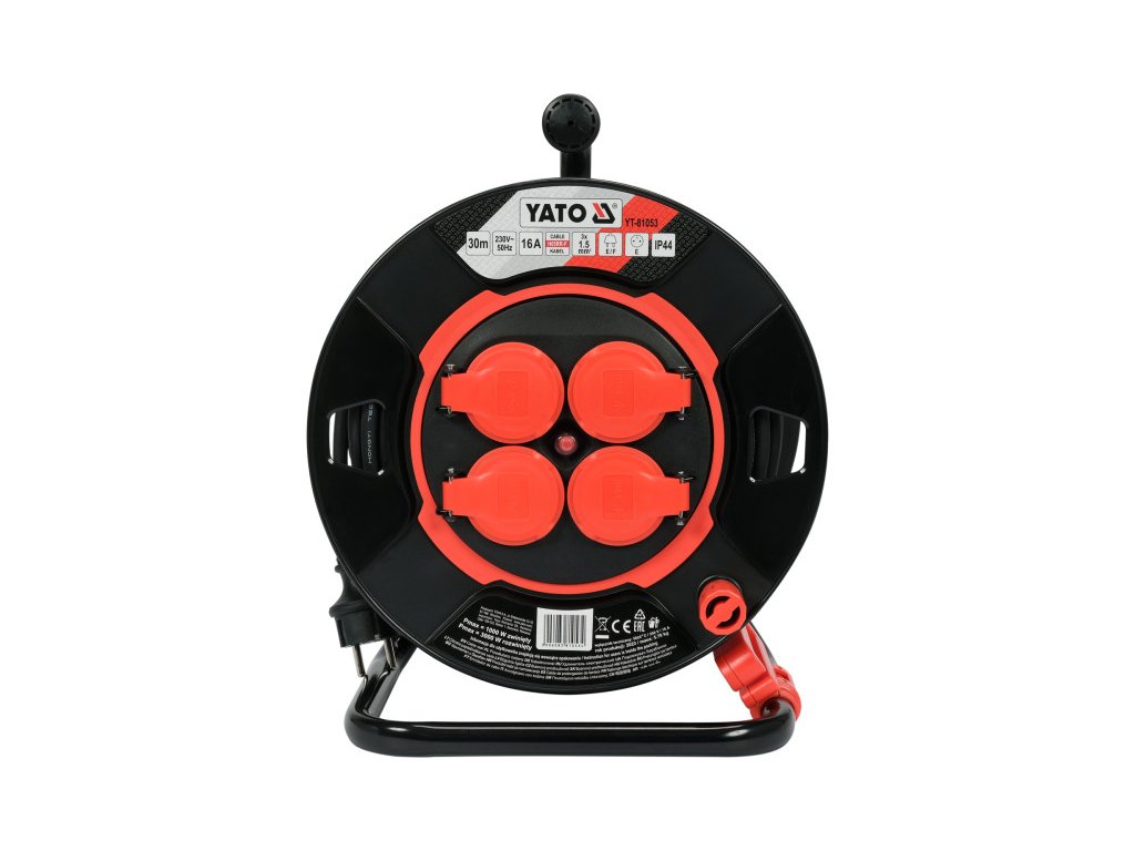 Építkezési hosszabbító tápkábel, YT-81053 cikkszámú, 30 méteres hosszúságú, 4 por- és fröccsenő vízálló aljzattal, hővédelemmel és gyermekvédelemmel. A természetes gumi bevonatú kábel egy strapabíró műanyag dobra van csévélve, ami a hosszabbító kábelt bel- és kültéri használatra is alkalmas, például építkezéseken, kertekben, gyárudvarokon.