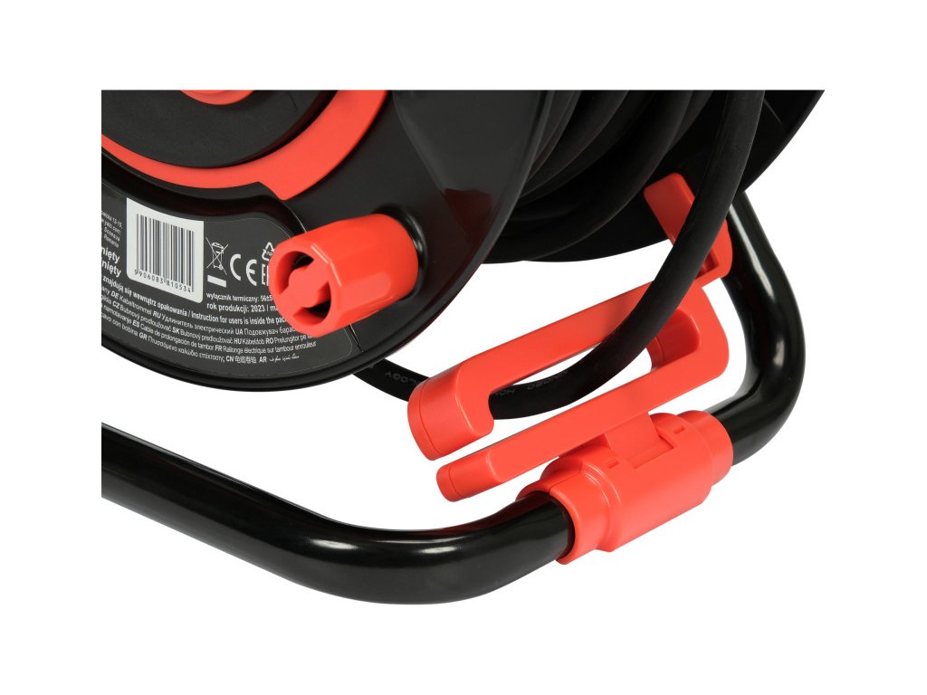 A dob erős fém kereten áll, ergonomikus fogantyúval. A dob szélén lévő fogantyú meggyorsítja a visszahúzást, és a dugó előtt néhány centiméterrel a kábelhez rögzített gumielem lehetővé teszi a beakasztását, például a dob szélére, ami nagyban megkönnyíti a visszahúzott hosszabbító kábel tárolását és szállítását.