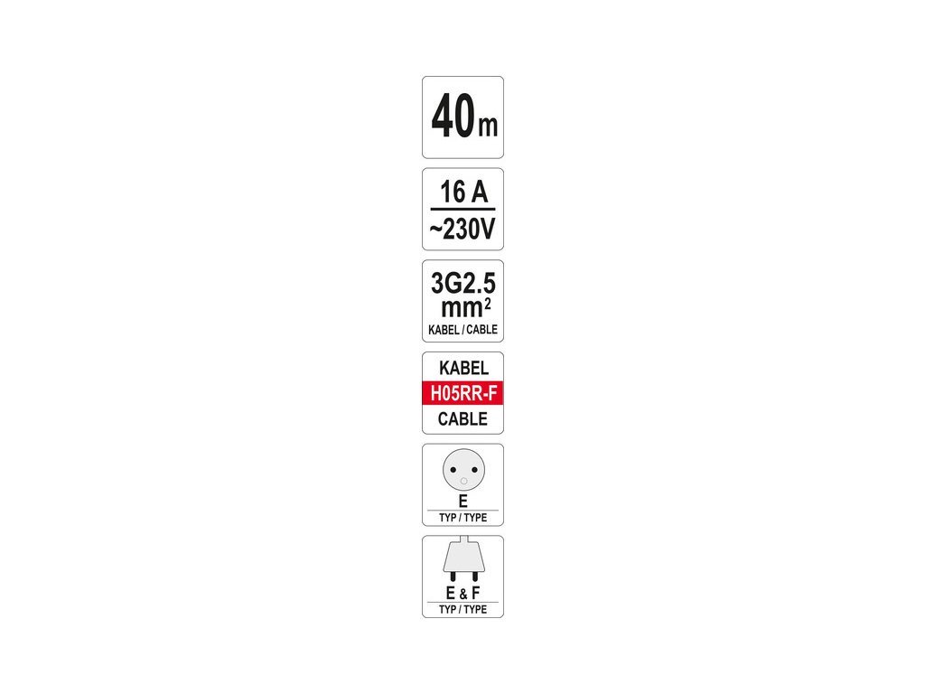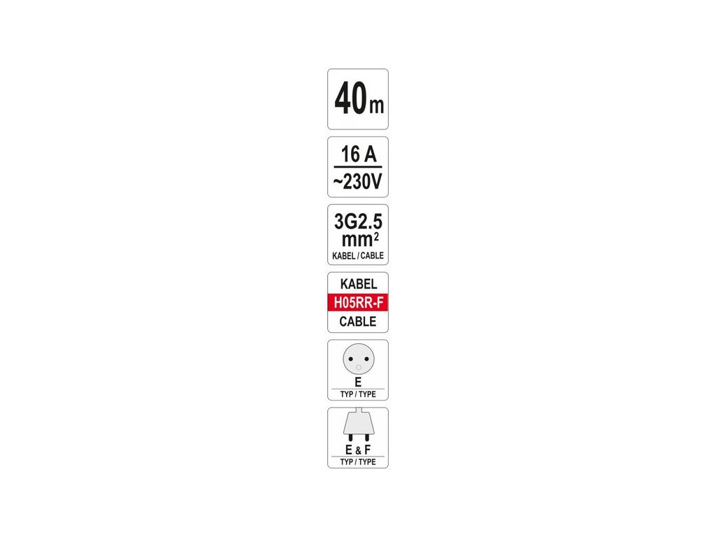 Építkezésekhez és műhelyekhez készült hosszabbító tekercs, az YT-8107, 40 méter hosszúságban, 4 por- és fröccsenő vízálló aljzattal, hővédelemmel és gyermekvédelemmel. A természetes gumi bevonatú kábel, melyet tartós műanyag dobba tekertünk, alkalmas belső és külső használatra is, mint például építkezések, kertek, gyári udvarok.