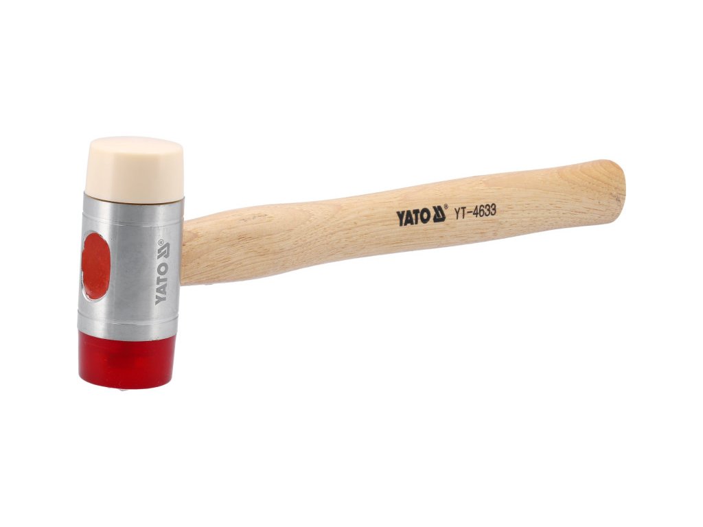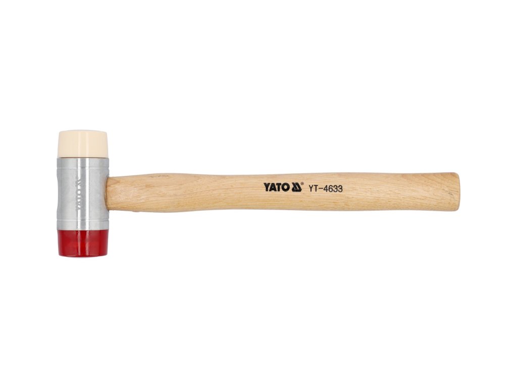 Egy 600g lemezmunkás kalapács 45mm átmérőjű, cserélhető fejekkel.