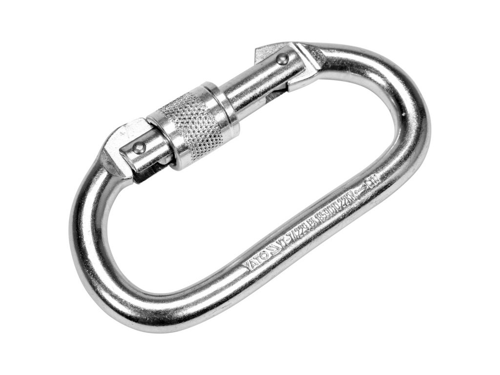 Önzáró karabiner YT-74229 manuális csavarral, mely egy esés megállító rendszer része. A karabinert összekötőelemként használják olyan dolgokhoz, mint a biztonsági öv, kötelek, kábelek, segédhevederek, valamint a lökéscsillapítóhoz.