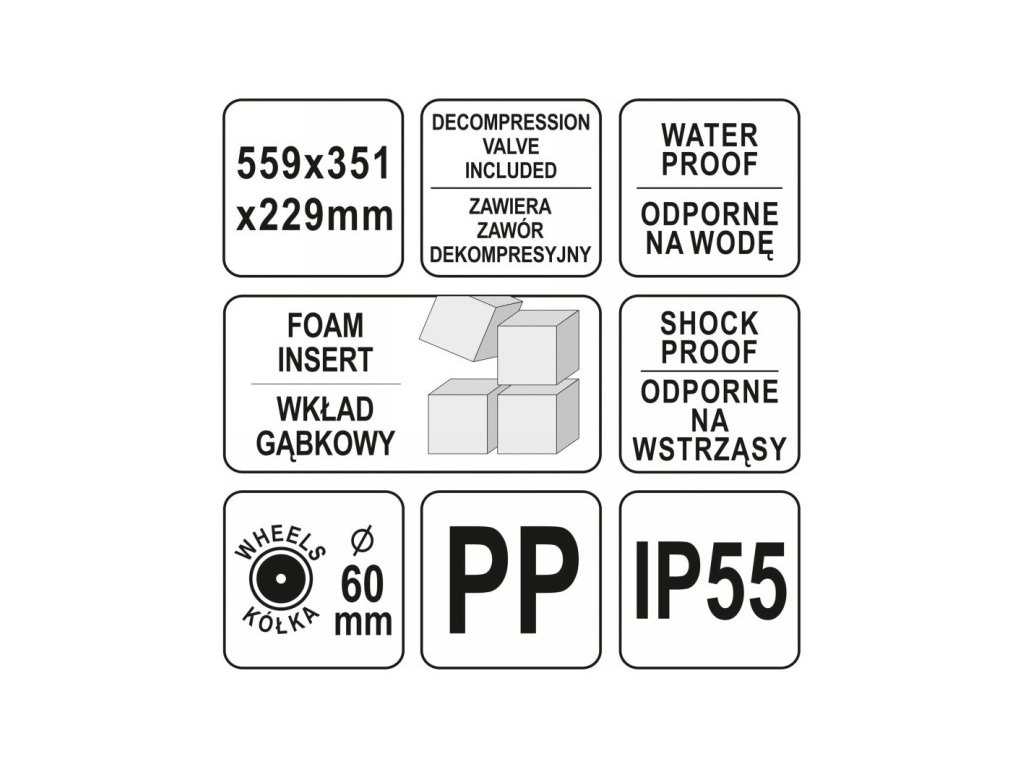 Hermatikus, vízálló és porálló tok, mely sokféle vegyi anyagnak és korróziónak ellenáll. Rugalmas polipropilénből készült az IP55 ellenállási osztály szerint. Tartalmaz egy hatékony tömítő rendszert, amelyet egy dekompressziós szeleppel gazdagítottak a nyomás kiegyenlítéséhez légiközlekedés során.