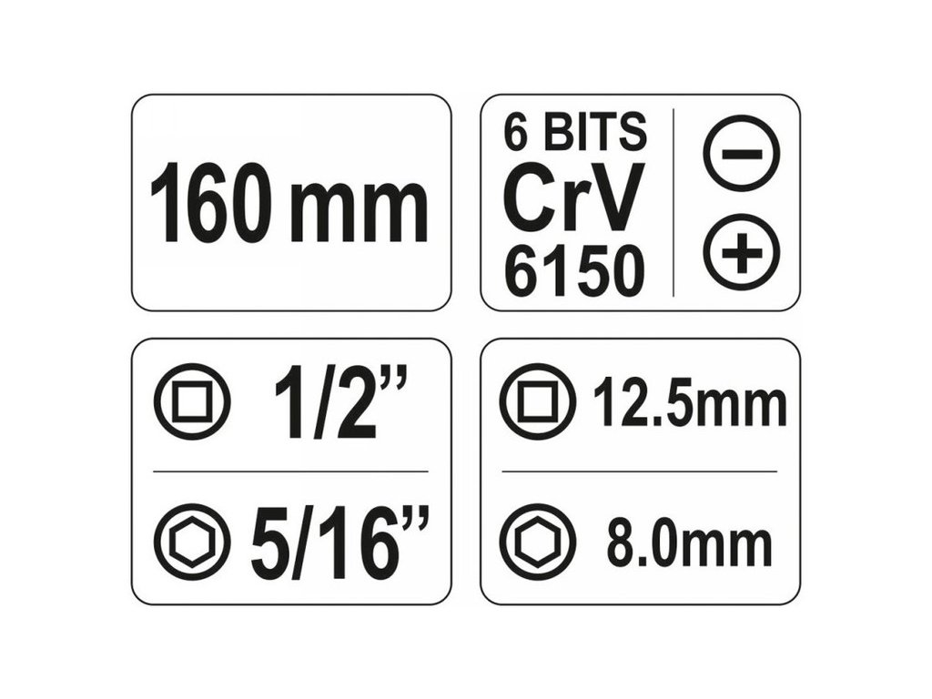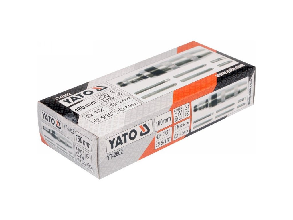 160 mm hosszúságú Yato márkaú ütvefúró csavarhúzó, a készletben 6 darab bit található. A bitek strapabíró CrV 6150 acélból készültek, a készletet praktikus tokban szállítjuk.