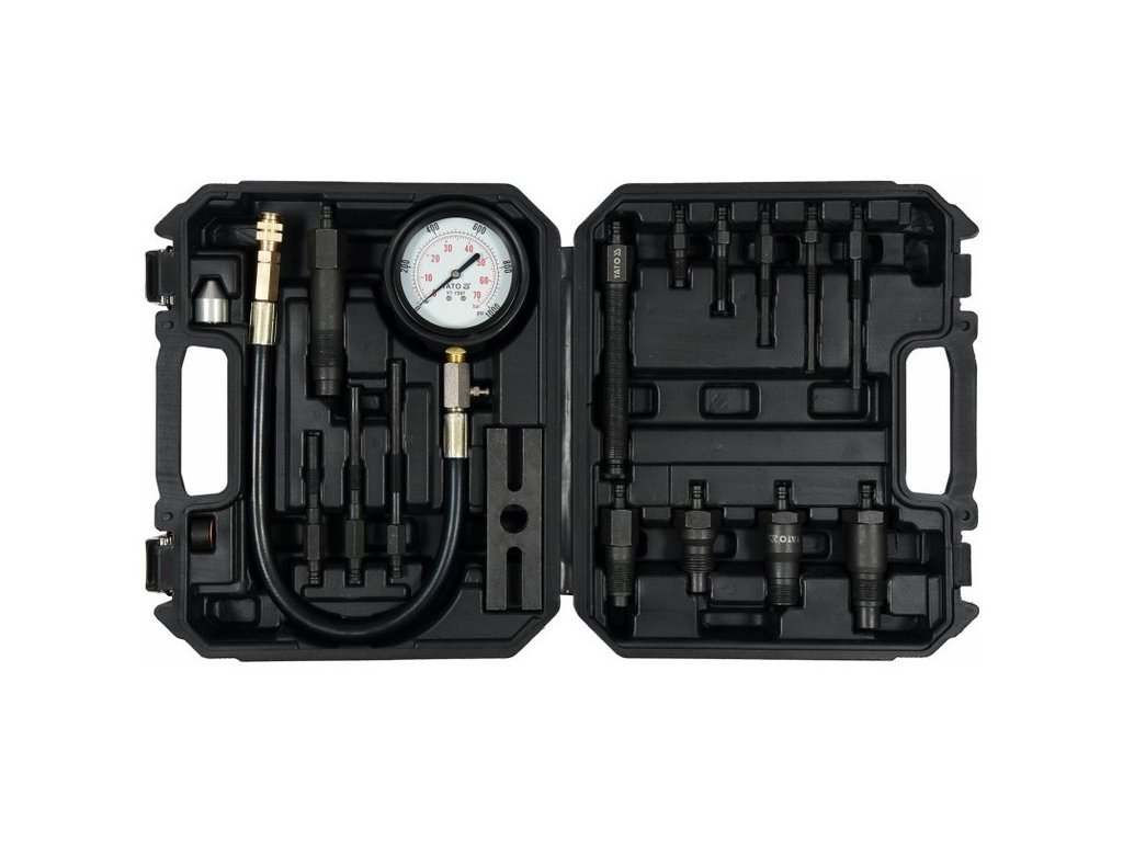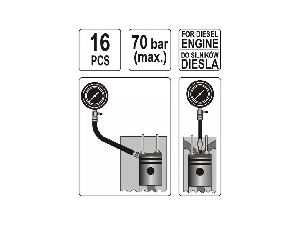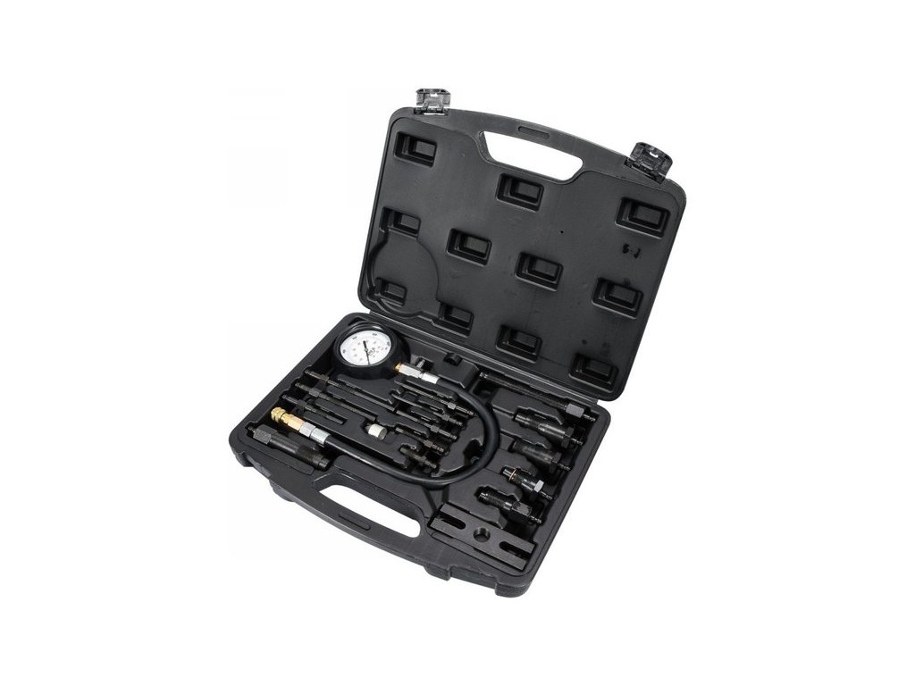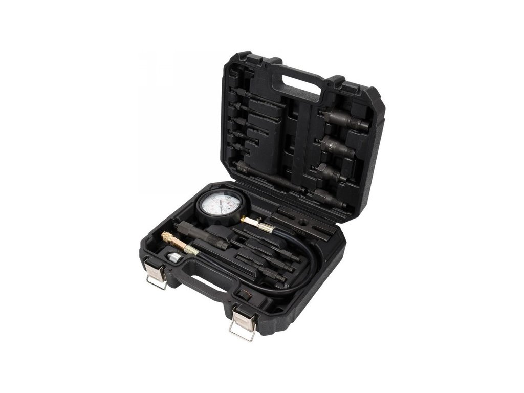 A mérőműszer szakmai használatra készült az autójavító szervizek számára. Használható benzinmotoros személyautók és kisteherautók motorjának diagnosztizálására: VW, Audi, Seat, Skoda, Fiat, Alfa Romeo, Lancia, Peugeot, Ford, Opel, Toyota, Mercedes, Rover. Készült C45 acélból, oxidált felülettel, ami megfelelő tartósságot biztosít a szerszámnak. - 91 mm-es izzítógyertya adapter, M10 x 1 - 119 mm-es izzítógyertya adapter, M10 x 1 - 135 mm-es izzítógyertya adapter, M10 x 1.25 - 118 mm-es izzítógyertya adapter, m22 x 1.5 - 113 mm-es izzítógyertya adapter, M10 x 1 - 102 mm-es izzítógyertya adapter, M10 x 1 - 83 mm-es izzítógyertya adapter, M10 x 1 - 64 mm-es izzítógyertya adapter, M10 x 1.25 - 47 mm-es izzítógyertya adapter, M12 x 1.25 - injektor adapter 88 mm, m24 x 1.5 - injektor adapter 73 mm, m22 x 1.5 - 63 mm-es injektor adapter, m24 x 2 - 75 mm-es injektor adapter, M20 x1.5 - univerzális adapter 160 mm - H - tömörítési nyomásmérő 500 mm - kioldószelep - használati útmutató - bőrönd