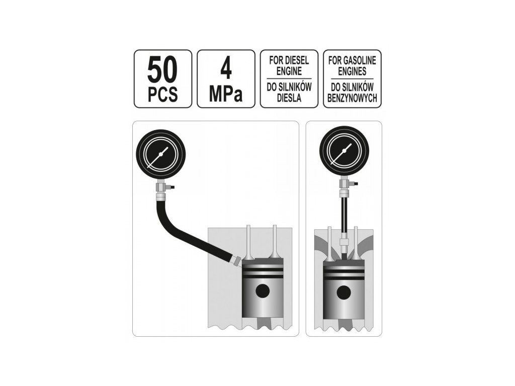 Súprava testerov kompresie 50 kusov pre dieselové a benzínové motory 40 bar YATO