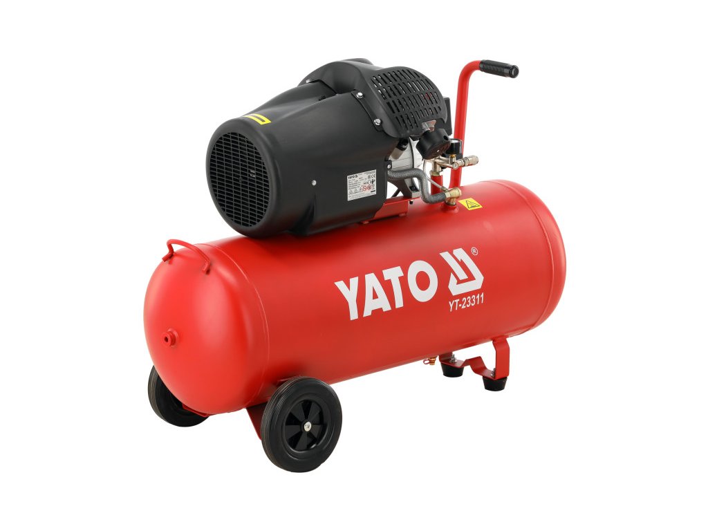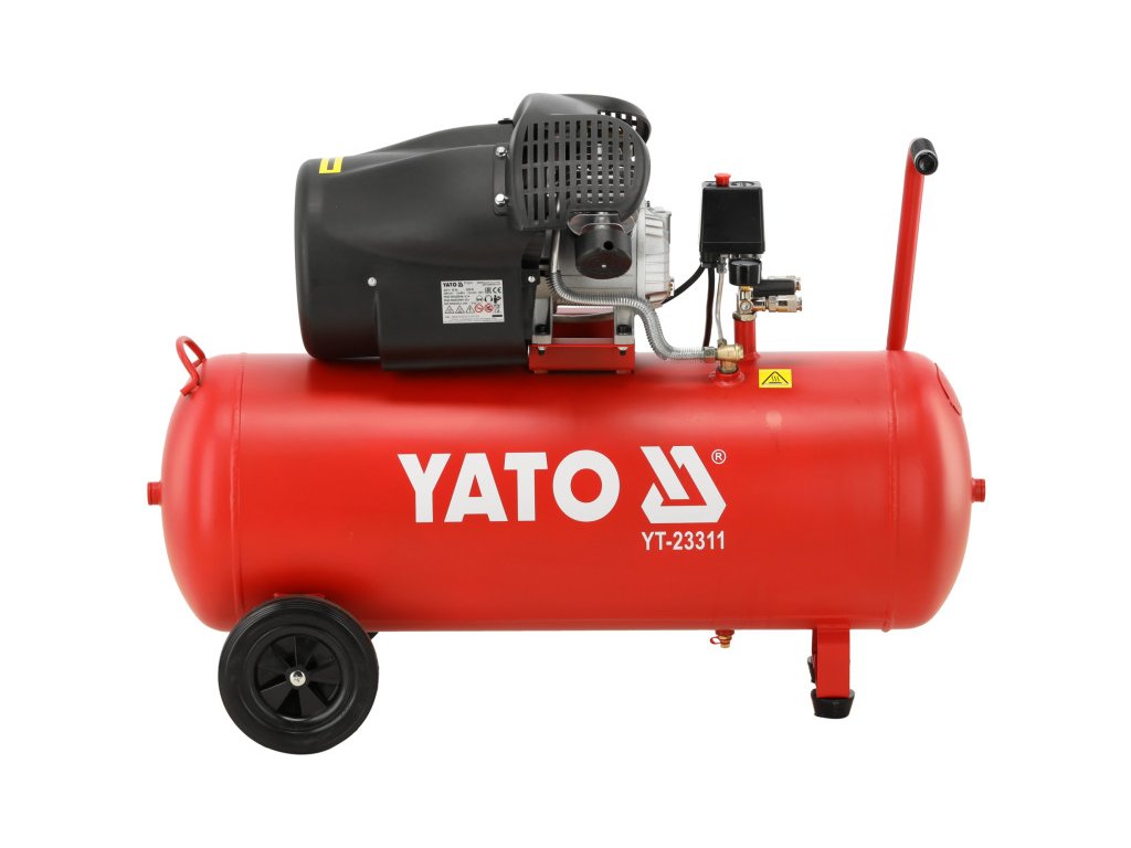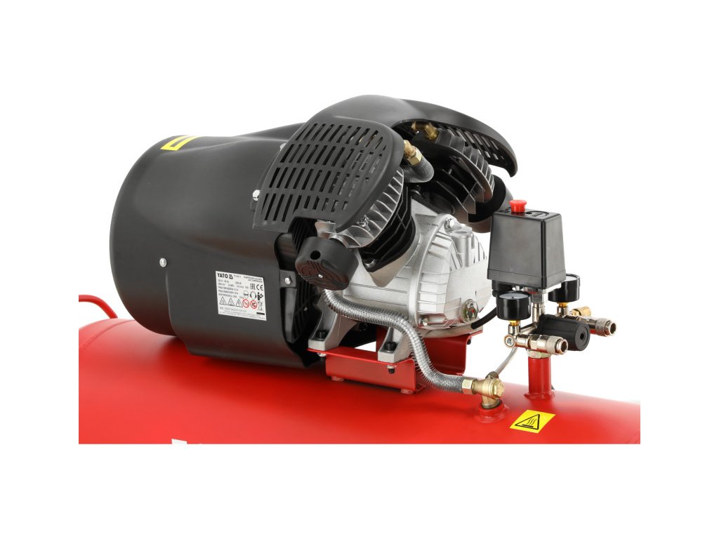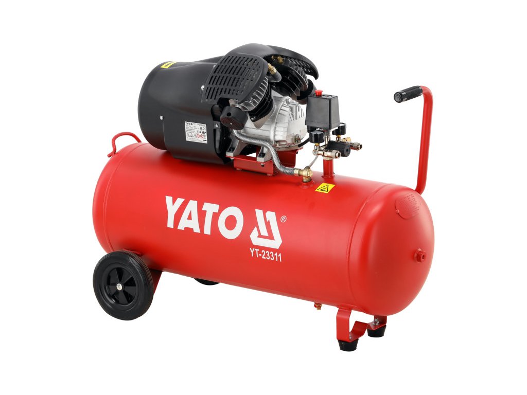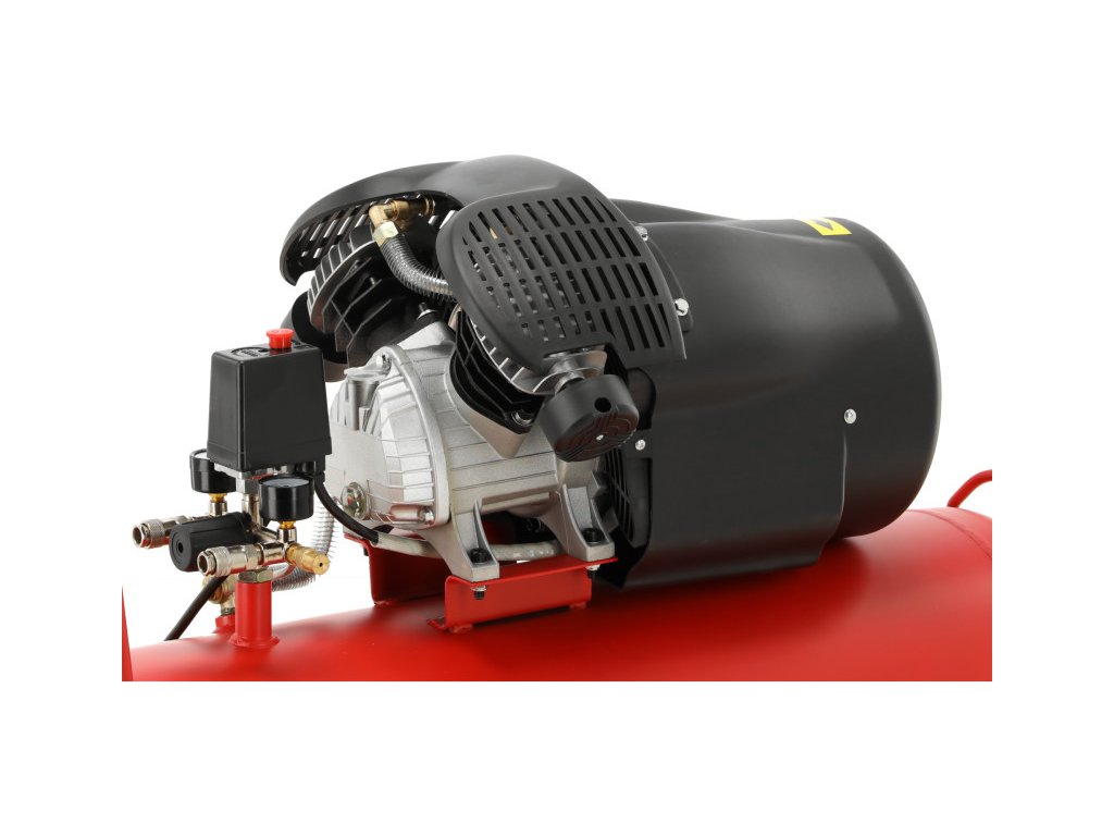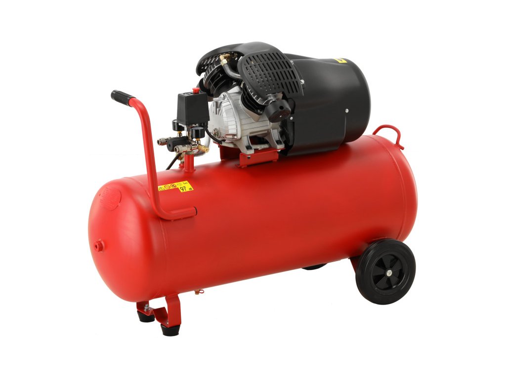 Két hengeres légsűrítő két csatlakozással és nyomásszabályozással. Sűrített levegős eszközök hajtására, lyukak fúvására és felületek tisztítására használható az iparban, műhelyekben, mezőgazdaságban, építkezéseken.