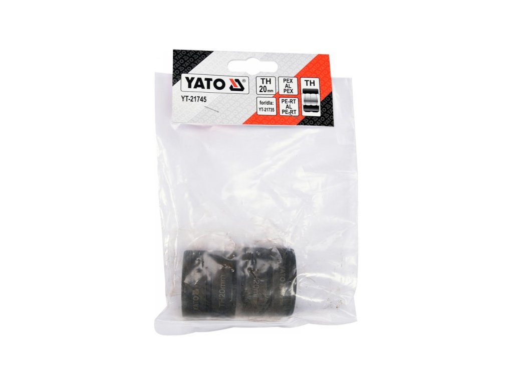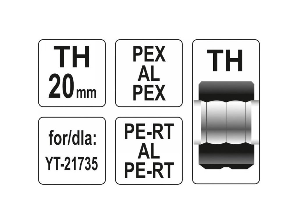 Kiegészítő TH-típusú szerelvény, mely a YT-21735 préshez lett tervezve. TH-típusú szerelvények összesajtolására használható 20mm méretben PEX csöveken.