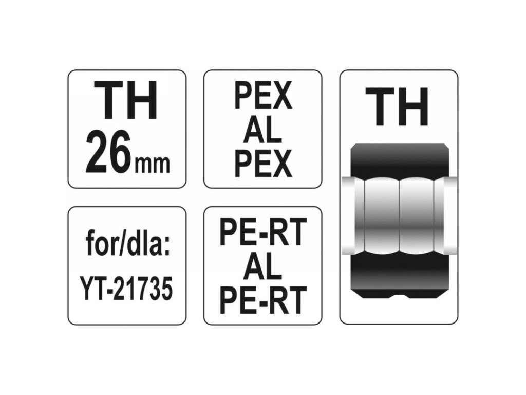 Kiegészítő TH-típusú szerelvény, amely a YT-21735 préshez lett tervezve. TH-típusú szerelvények 26mm méretű préselésére használják PEX csöveken.