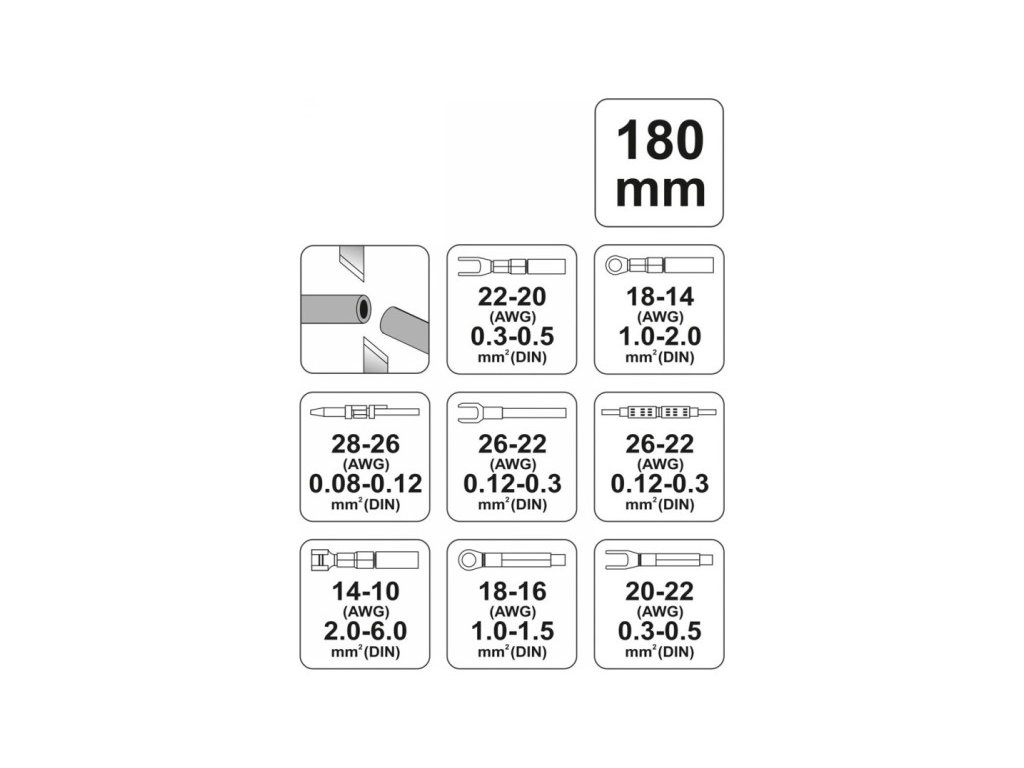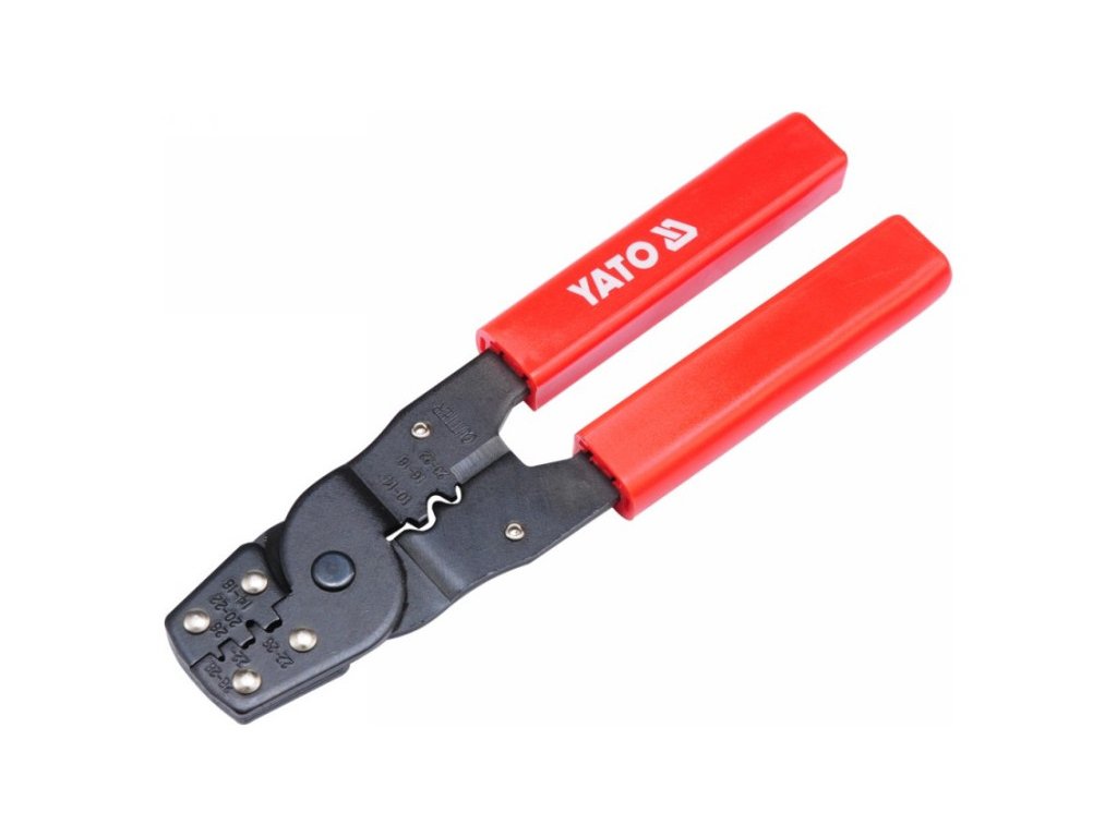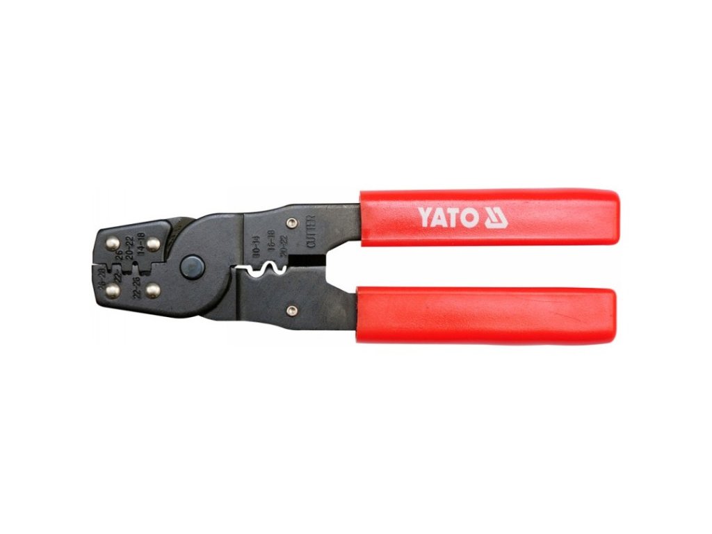 Krimpovacie kliešte na krimpovanie troch typov konektorov a strihanie drôtov, s lakovaným povrchom, ktorý chráni proti korózii, s plastovou rukoväťou.