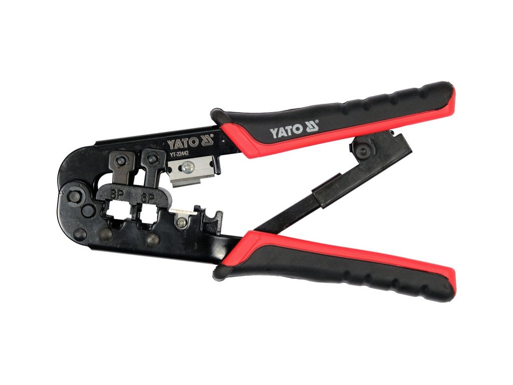 YT-22442 fogó ráccsal a telefon és hálózati végződések préseléséhez. A fogó szénacélból készült, amelyet oxidációs folyamatnak vetettek alá, így védelmet nyújt a korrózió ellen. Két komponensű műanyag fogantyúk. A keményebb PP komponens szorosan tapad a testhez, míg a TPR külső rész kellemes tapintású és csúszásgátló tulajdonságokkal rendelkezik
