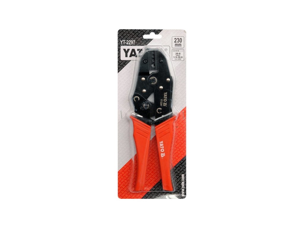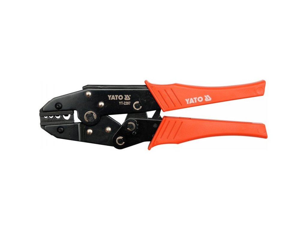 A YT-2297 préselő fogó prés csatlakozókhoz, feketedett felülettel, ami korrozió elleni védelmet biztosít, és műanyag fogantyú sapkákkal. A racsnis mechanizmus gyors és pontos szorítást tesz lehetővé túlzott erőkifejtés nélkül.