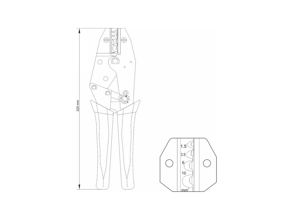 Lisovacie kliešte s račňovým mechanizmom, lakovaný povrch, ktorý chráni pred koróziou, plastový úchyt na rukoväti.