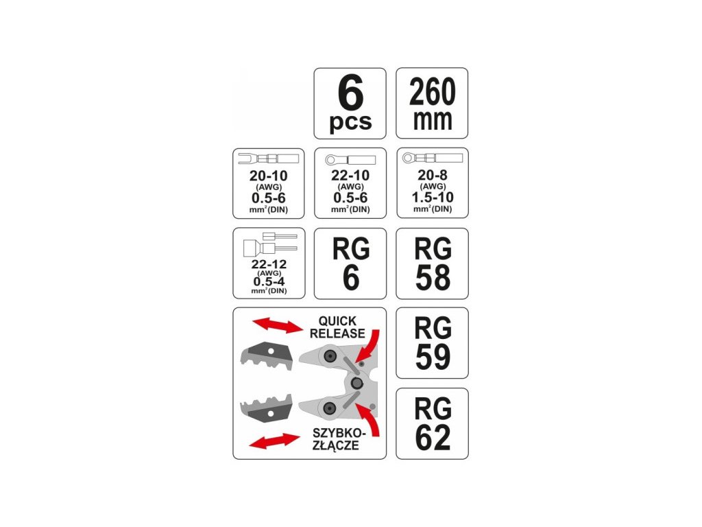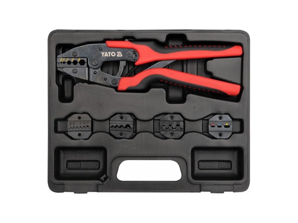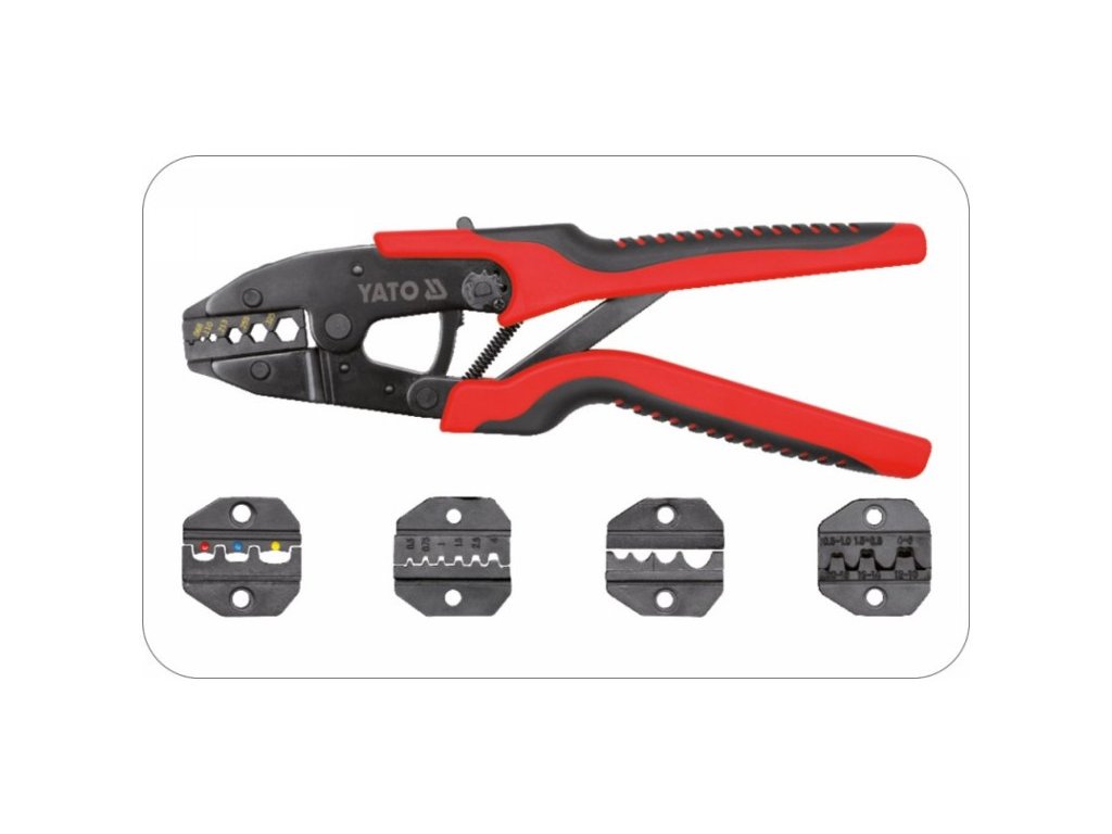 - öt cserélhető szerszámfej a legnépszerűbb csatlakozók behúzására, beleértve a nem szigetelt, szigetelt, összenyomott, hüvely, antenna csatlakozókat