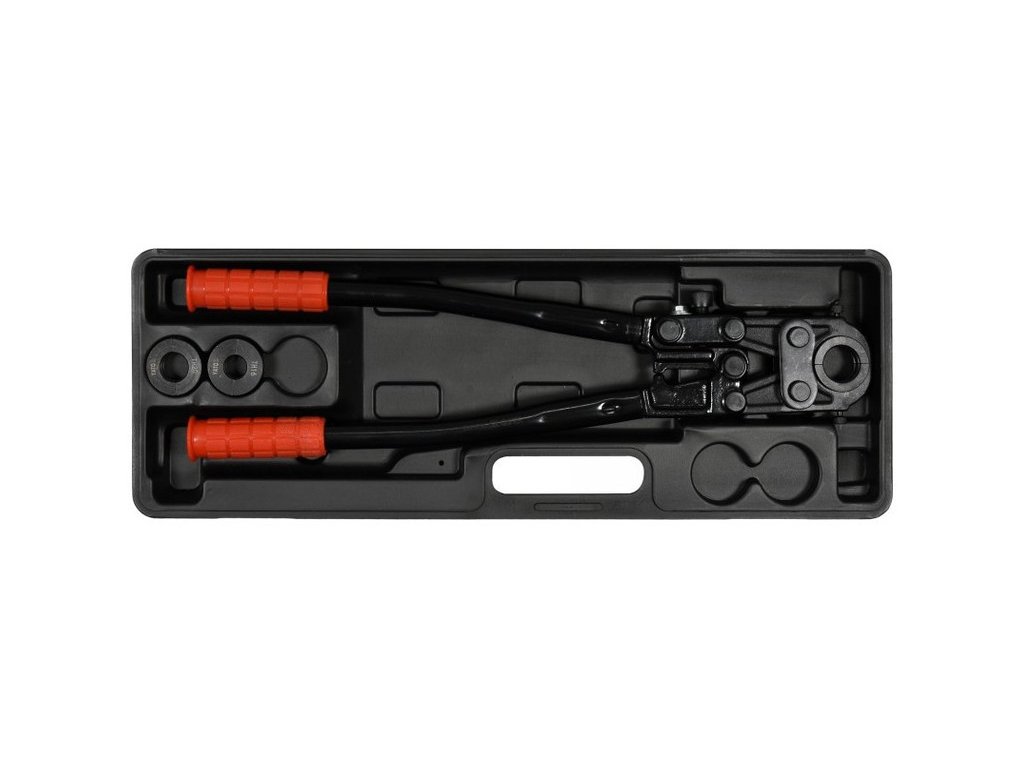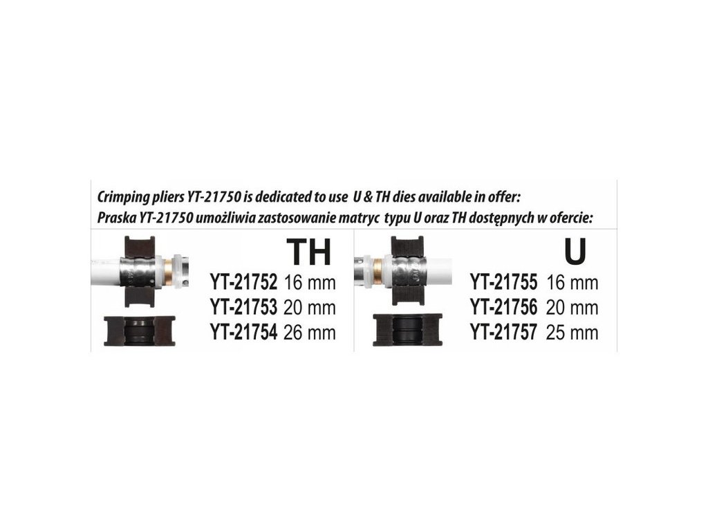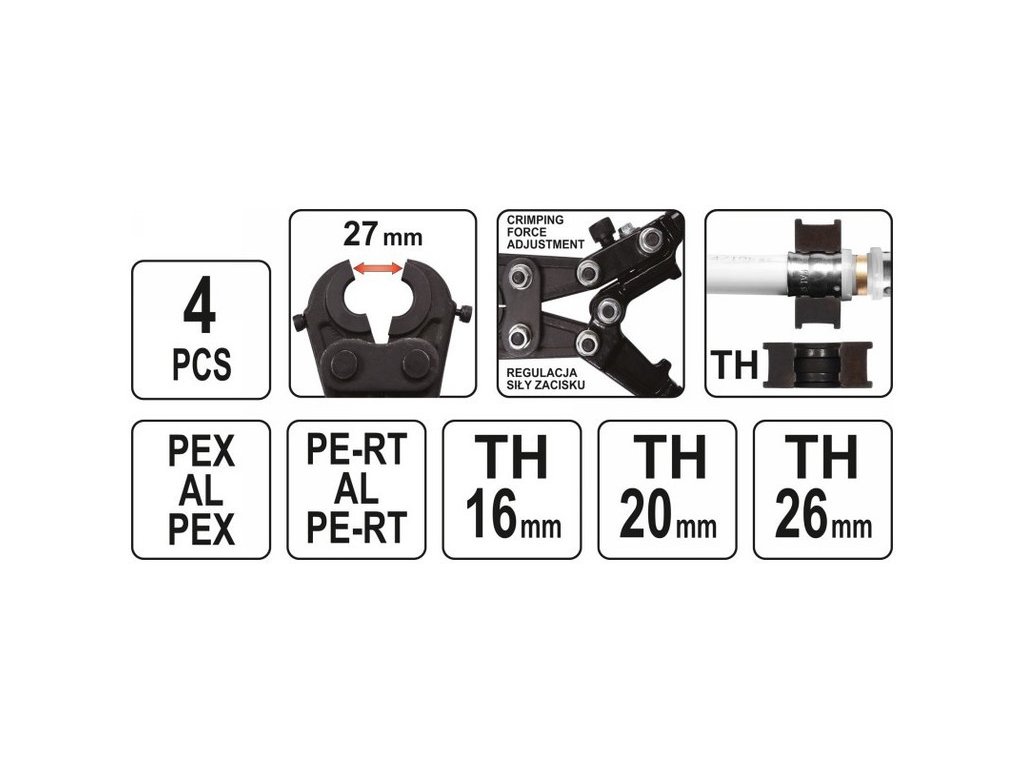 Krimpovacia súprava s 3 hlavami typu (TH a U) pre presné a tesné spojenie rúr PEX-AL-PEX a PERT-AL-PERT Technické údaje • otvor čeľuste 27 mm • celková dĺžka 52,5 cm • veľkosť hlavy príslušenstva 16, 20 a 26 mm