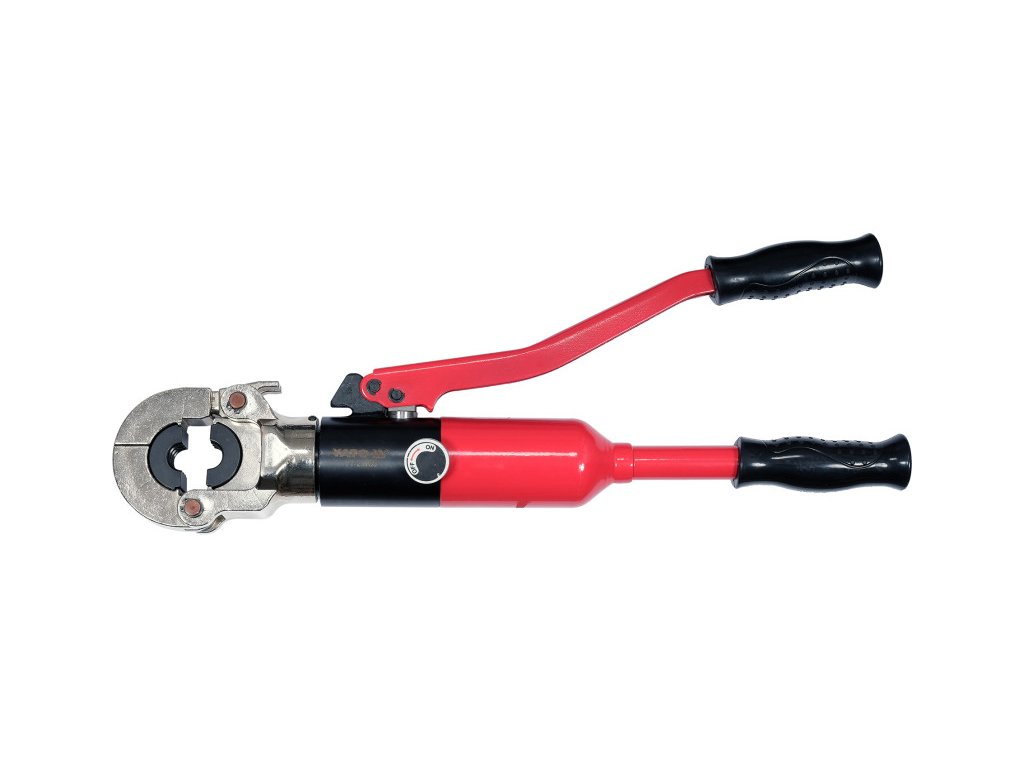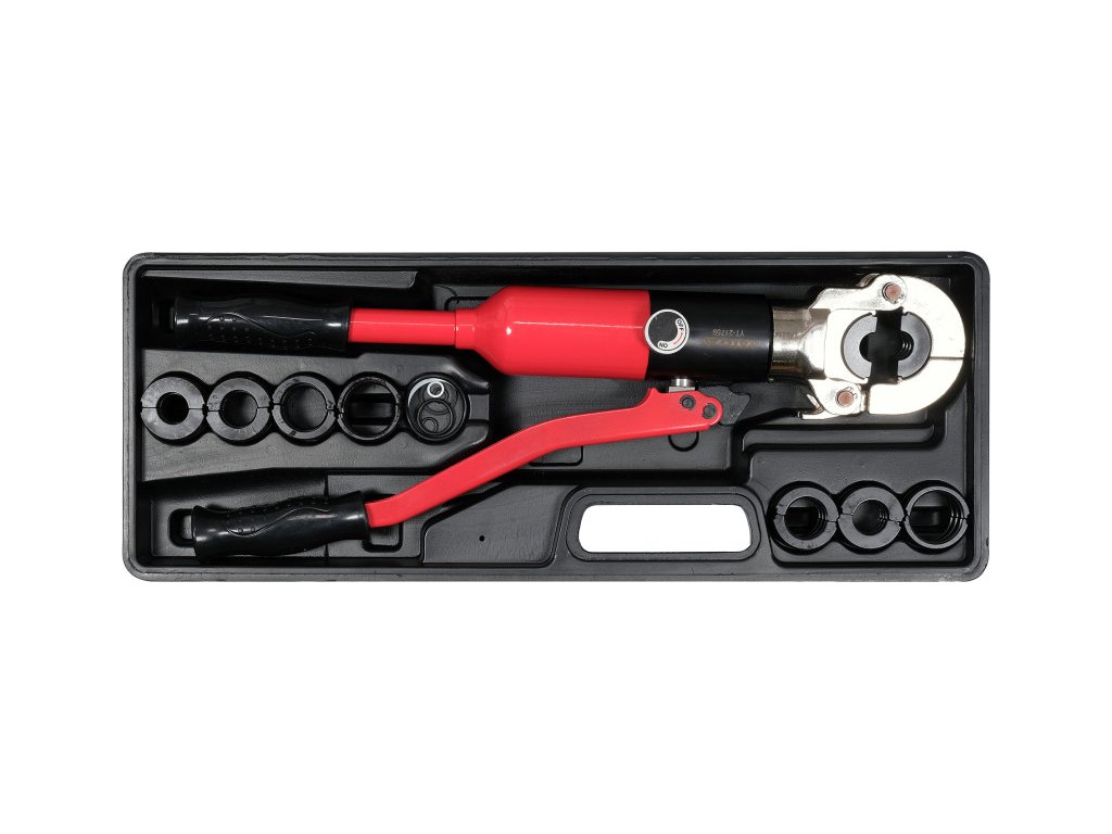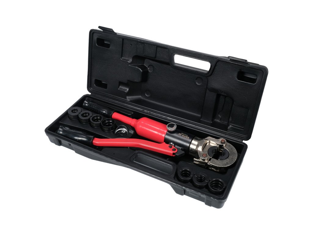 Kézi hidraulikus prés PEX-AL-PEX és PERT-AL-PERT csövek idomainak préselésére, 8 darab szerszámmal. Hidraulikus hengerrel van felszerelve, amely lehetővé teszi az idomok pontos és szoros préselését 10T préselőerővel. A 360°-ban forgatható fej lehetővé teszi a nehezen hozzáférhető helyeken való munkát. A gyors szerszámcsere rendszer könnyű cserét tesz lehetővé.