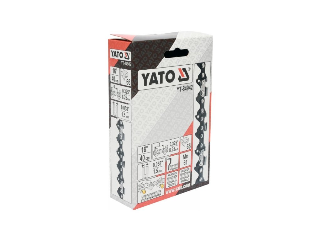 Benzin- és elektromos láncfűrészekhez tervezve. Tiszta és mérsékelten szennyezett fa otthoni és professzionális vágásához ajánlott. A YATO YT-84942 lánc használható láncfűrészekhez: - Dolmar: 109, 110, 111, 112, 113, 114, 115i, 116, ES1800, PS460, PS4600, PS4605, PS500, PS5000, PS5510, PS5100S, PS540 - Husqvarna: 154, 257, 440e, 133, 136, 137, 140, 141, 142, 234, 235, 238, 240, 240e, 242, 242XP, 246, 254, 254XP, 261, 262, 338XPT, 339XP, 340, 345, 346, 346XP, 350, 351, 353, 357, 357XP, 359, 36, 365, 372XP, 40, 41, 42, 435, 435E, 44, 444, 445, 445E, 45, 450E, 455, RANCHER, 455E RANCHER, 460 RANCHER, 50, 51, 55, T435 - Jonsered: 520, 2012, 2014, 2015, 2016, 2036, 2040, 2041, 2045, 2050, 2051, 2054, 2055, 063, 2141, 2145, 2147, 2149, 2150, 2152, 2153, 2155, 2156, 2159, 2163, 370, 380, 410, 420, 425, 435, 45, 450, 451, 451EVS, 452, 455, 490, 49SP, 50, 51, 510, 52, 521, 525, 535, 590, CS2149W, CS2152W - Makita: 45, DCS430, DCS43001, DCS4300I, DCS431, DCS460, DCS4600S, DCS4630, DCS500, DCS5000, DCS5030, DCS520, DCS5200I - NAC: NO-CS38, SPS01-45, SPS01-52, SPS02-45, YD 40/45, YD40, YD52 - Oleo-Mac: 850, 938, 940, 941, 942, 945, 946, 947, 950, 950 Super, 950A, 951, 952, 956, 962, E300F - Partner: 1650, 365, 400, 405, 410, 450, 460, 465, 470, 495, 500 ,510, 540, 545, P500, P5000, P5500