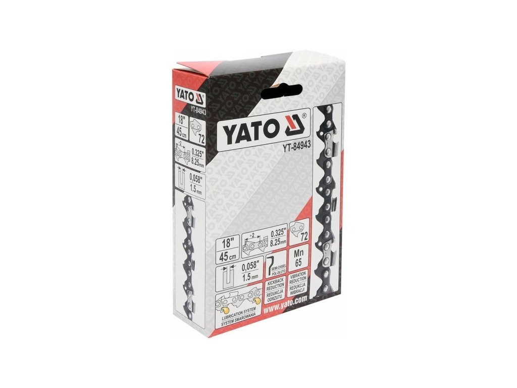 Az tervezték benzines és elektromos láncfűrészekhez - különösen ajánlott a YT-84936 vezetősín használatához a YT-84900 láncfűrészhez. Ajánlott tiszta és közepesen szennyezett fa vágásához, mind otthoni, mind szakmai használatra. A YATO YT-84943 lánc használható a következő láncfűrészekhez: - Dolmar: 109, 110, 111, 112, 113, 114, 115i, 116, ES1800, PS460, PS4600, PS4605, PS500, PS5000, PS5510, PS5100S, PS540 - Husqvarna: 154, 257, 440e, 133, 136, 137, 140, 141, 142, 234, 235, 238, 240, 240e, 242, 242XP, 246, 254, 254XP, 261, 262, 338XPT, 339XP, 340, 345, 346, 346XP, 350, 351, 353, 357, 357XP, 359, 36, 365, 372XP, 40, 41, 42, 435, 435E, 44, 444, 445, 445E, 45, 450E, 455, RANCHER, 455E RANCHER, 460 RANCHER, 50, 51, 55, T435 - Jonsered: 520, 2012, 2014, 2015, 2016, 2036, 2040, 2041, 2045, 2050, 2051, 2054, 2055, 063, 2141, 2145, 2147, 2149, 2150, 2152, 2153, 2155, 2156, 2159, 2163, 370, 380, 410, 420, 425, 435, 45, 450, 451, 451EVS, 452, , 455, 490, 49SP, 50, 51, 510, 52, 521, 525, 535, 590, CS2149W,, CS2152W - Makita: 45, DCS430, DCS43001, DCS4300I, , DCS431, DCS460, DCS4600S, DCS4630, DCS500, DCS5000, DCS5030, DCS520, DCS5200I - NAC: NO-CS38, SPS01-45, SPS01-52, SPS02-45, YD 40/45, YD40, YD52 - Oleo-Mac: 850, 938, 940, 941, 942, 945, 946, 947, 950, 950 Super, 950A, 951, 952, 956, , 962, E300F - Partner: 1650, 365, 400, 405, 410, 450, 460, 465, 470, 495, 500, 510, 540, 545, P500, P5000, P5500"