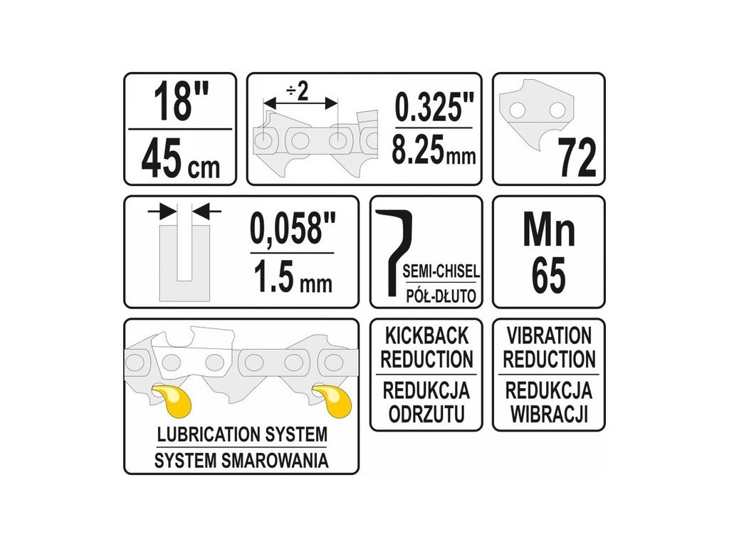 Hossza 18", 72 láncszem, osztás 0.325", szélesség 0.058" (1,5 mm).