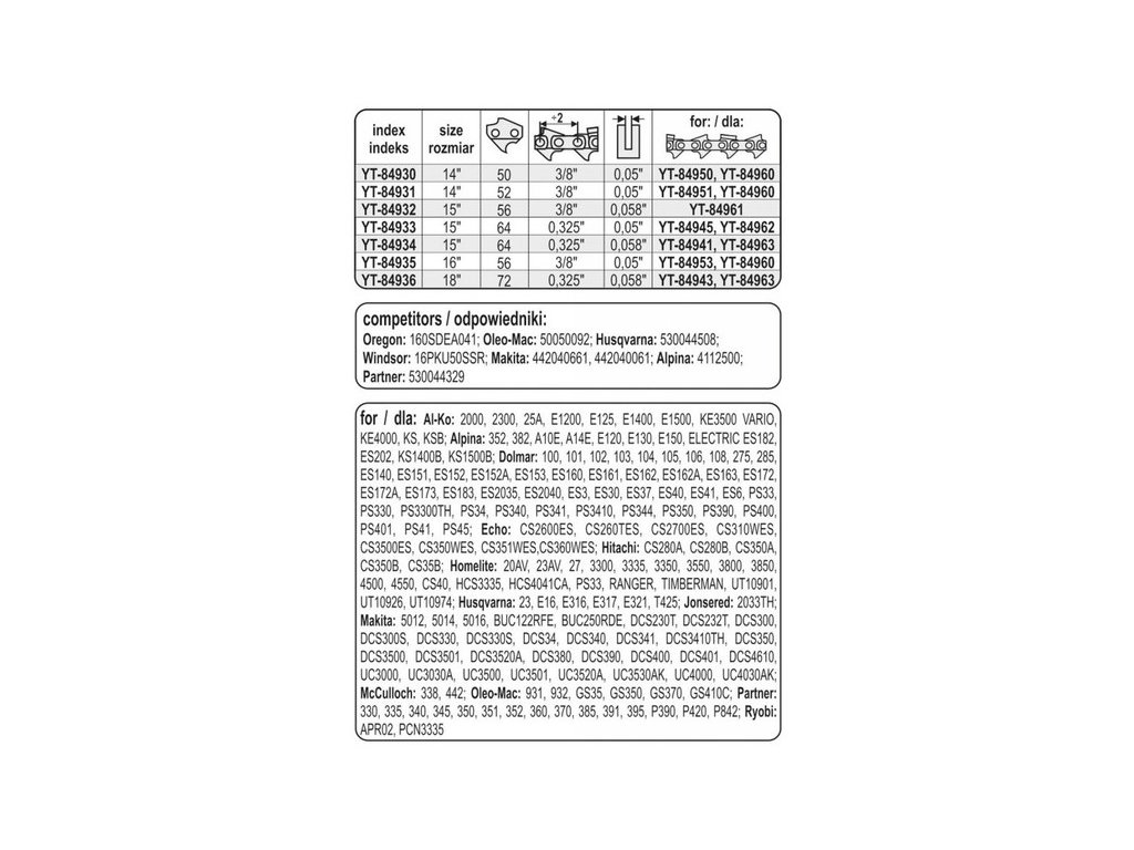 Ajánlott a vezetők használata YATO YT-84963 vagy YT-84960 láncokkal. Lehetőség van azok használatára más gyártók láncainak is.