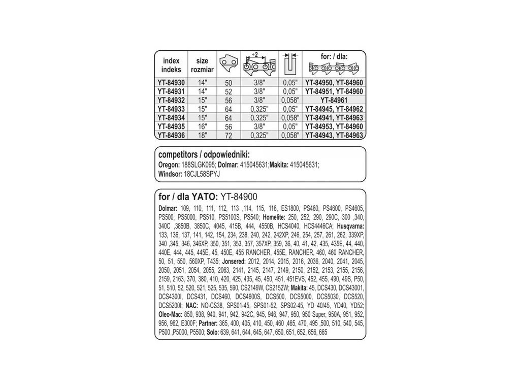 A ház körüli munkákra, a kertben vannak kialakítva. Sikeresen használhatóak fakivágási munkálatokhoz is. Javasolt a vezetők használata YATO YT-84943 vagy YT-84963 láncokkal. Lehetőség van azok használatára más gyártók láncainak használatával is.
