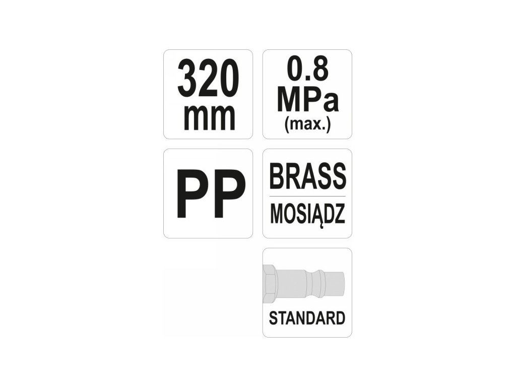 • Dĺžka dýzy: 320 mm • Tlak: 8 bar • Veľkosť pripojenia vzduchovej hadice: 1/4 palca / 6,3 mm