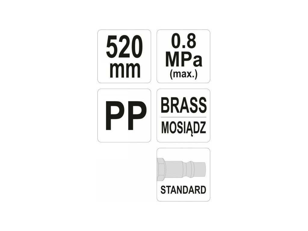 • Dĺžka dýzy: 520 mm • Tlak: 8 bar • Veľkosť pripojenia vzduchovej hadice: 1/4 palca / 6,3 mm