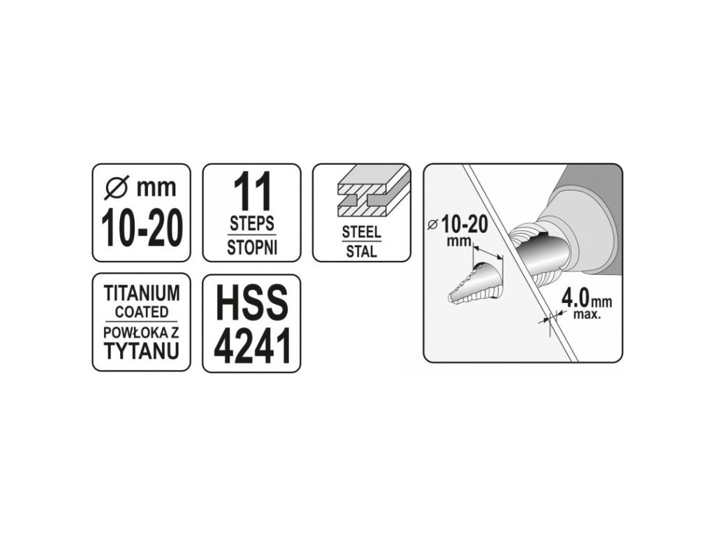Krokový vrták 10-20 mm 11-stupňový HSS titán-nitrid YATO