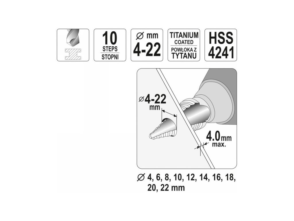 Stupňovitý vrták 4-22 mm 10-stupňový HSS titán-nitrid YATO