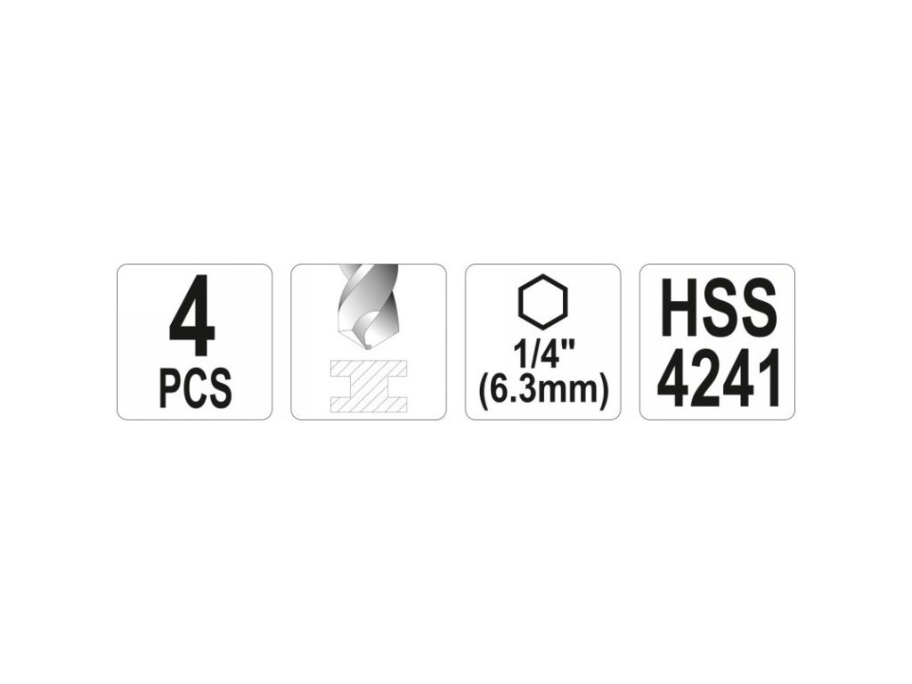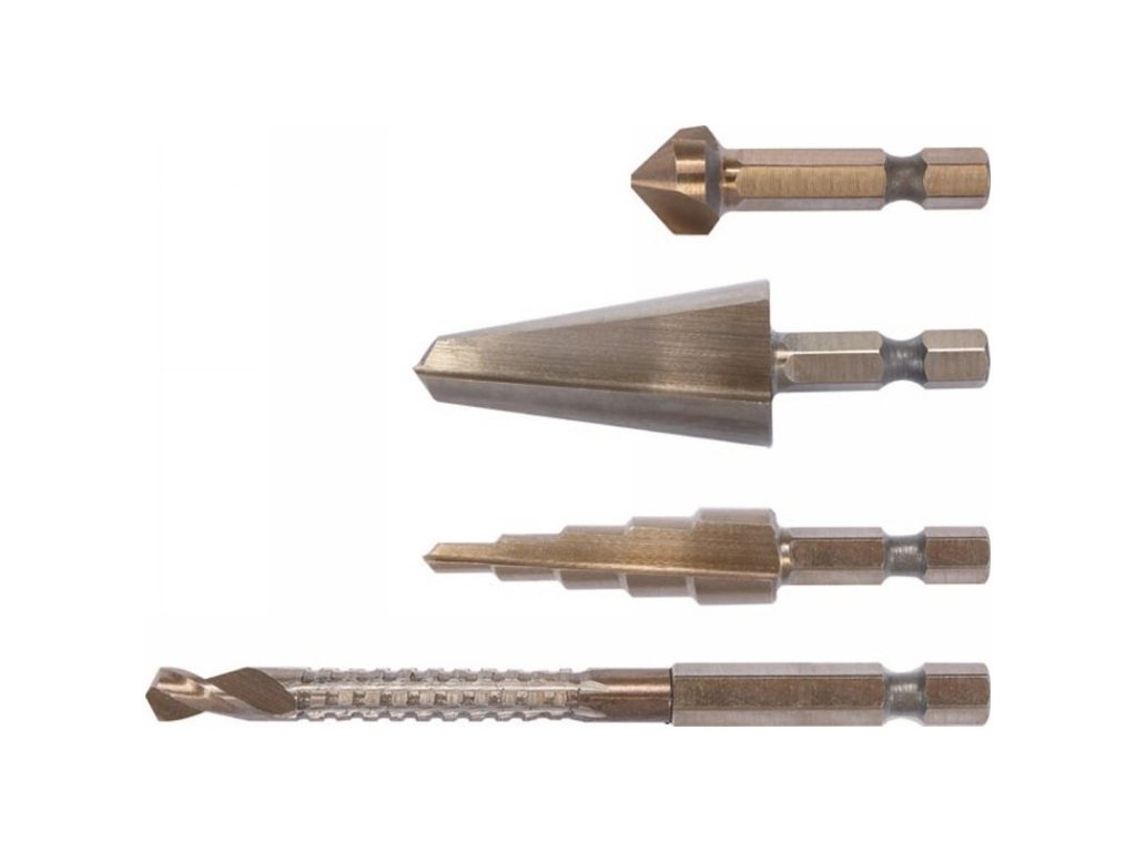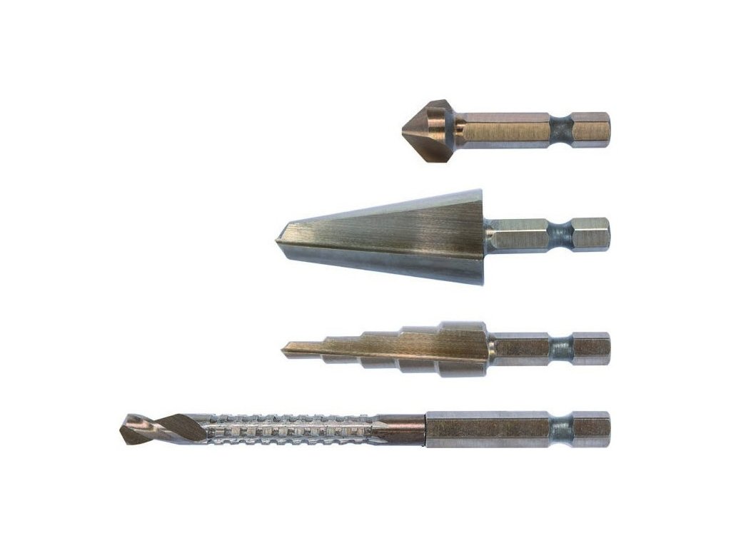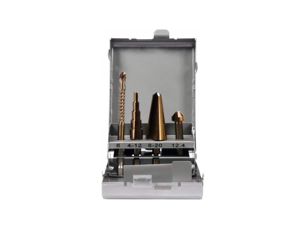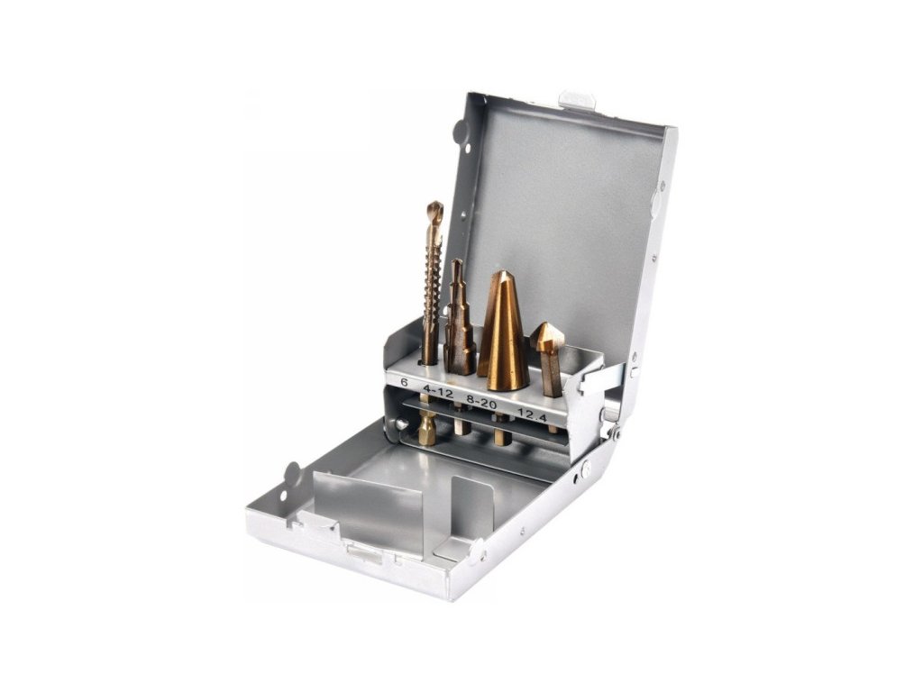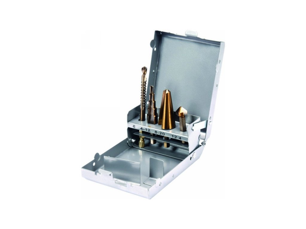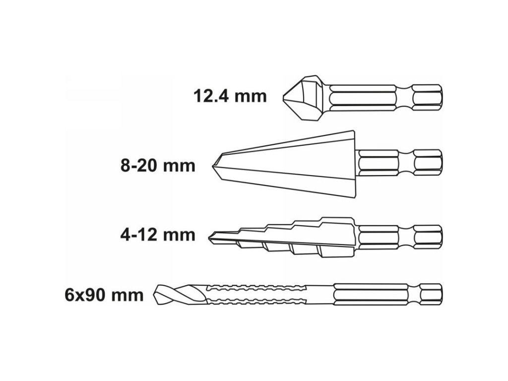 • materiál: nástrojová oceľ HSS 4241 • stopka frézovacieho vrtáku: 6 x 90 mm • vrták so stupňovitou doskou: 4-12 mm • vrták do dosky: 8-20 mm • kužeľový záhlbník: 12,4 mm