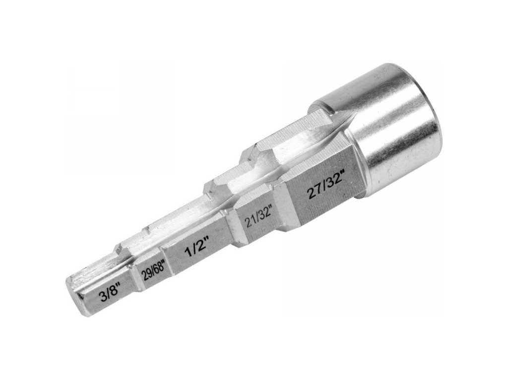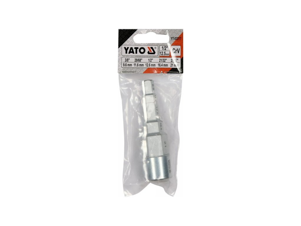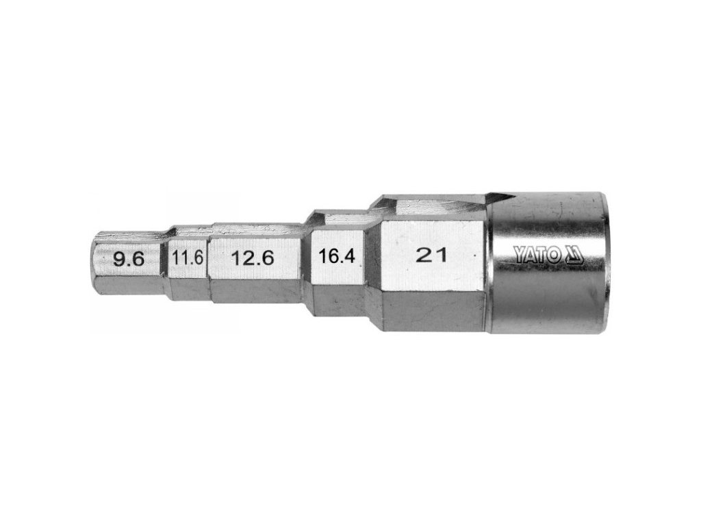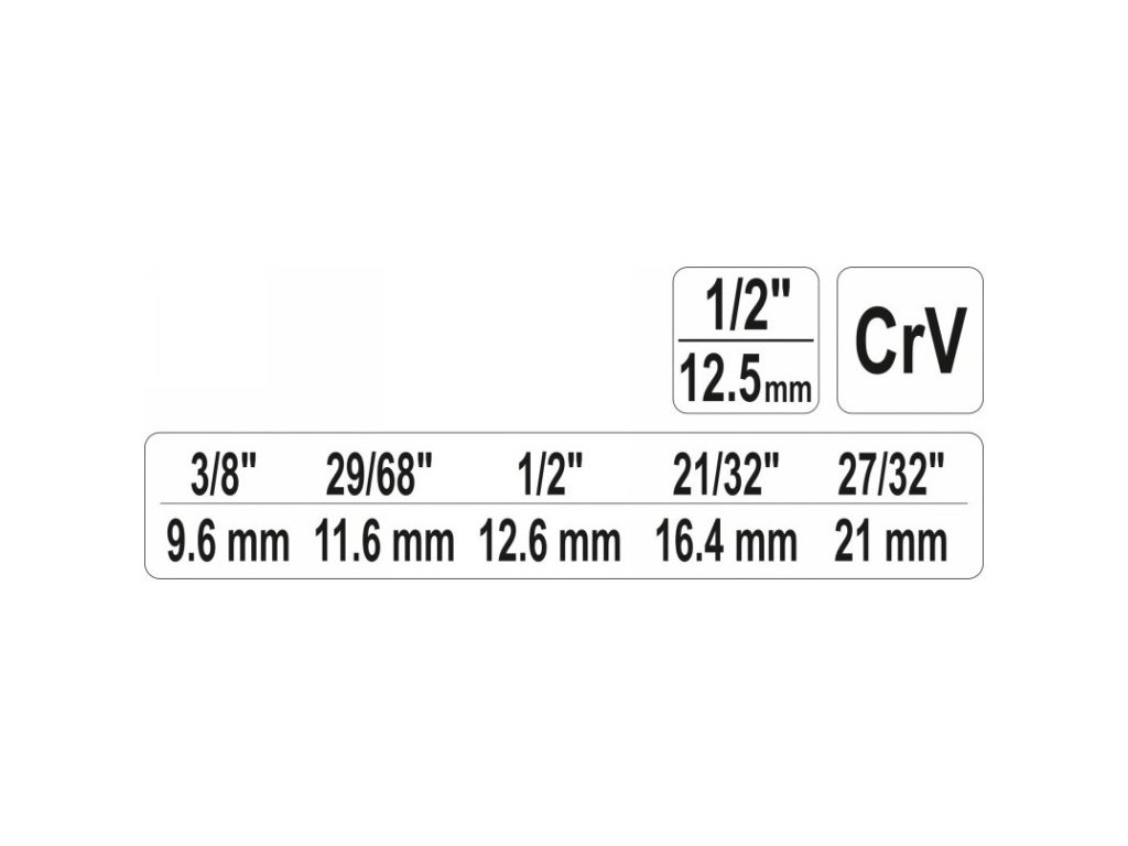 Egy 3/8" (9.6 mm) / 29/68" (11.6 mm) / 1/2" (12.6 mm) / 21/32" (16.4 mm) / 27/32" (21 mm) hajtókaros lépéses kulcs, magas minőségű CRV acélból készült. Mindkét oldalán fogazat található, melyek csavarókulcs beillesztésére szolgálnak.