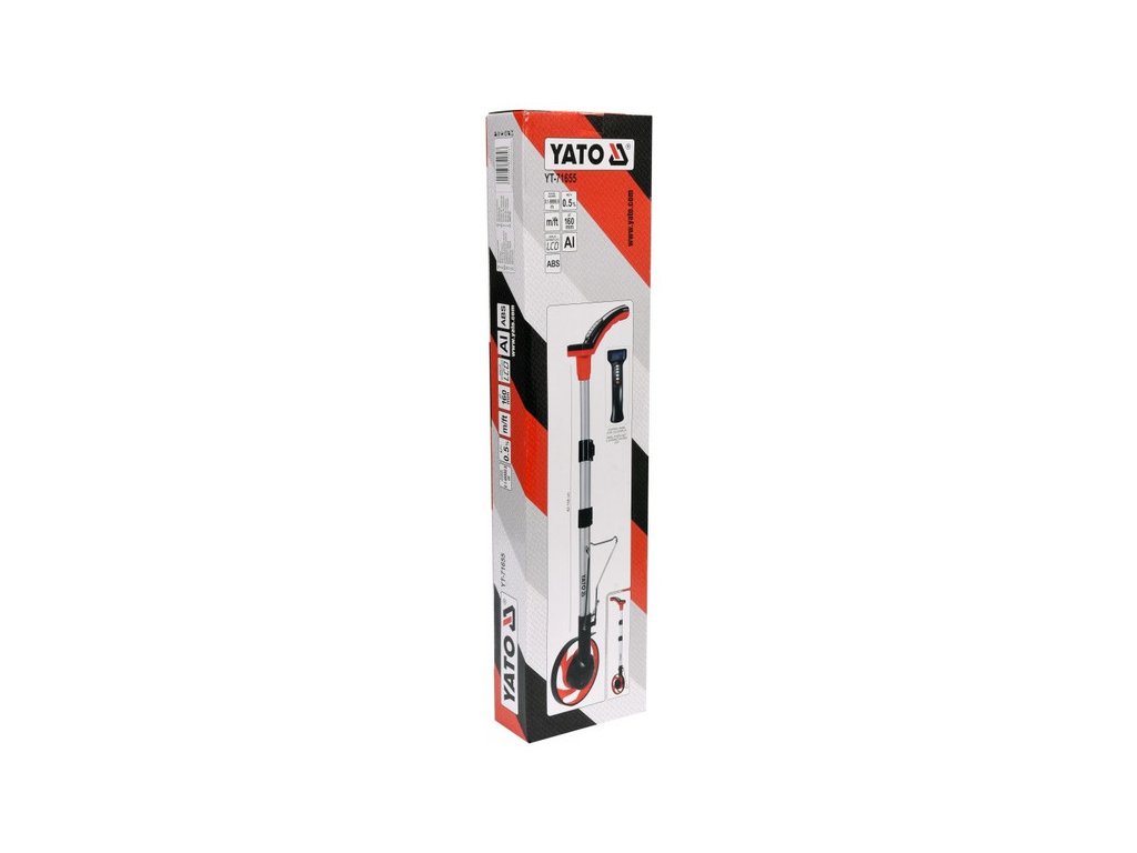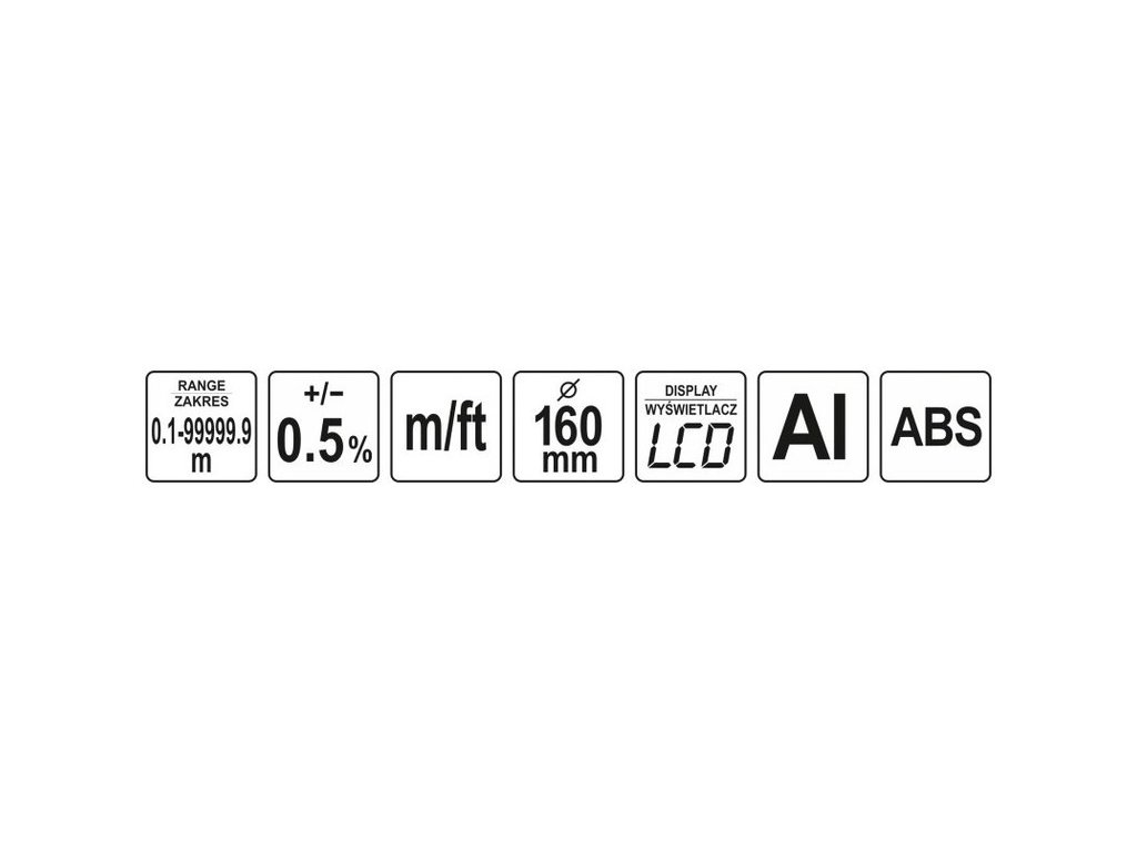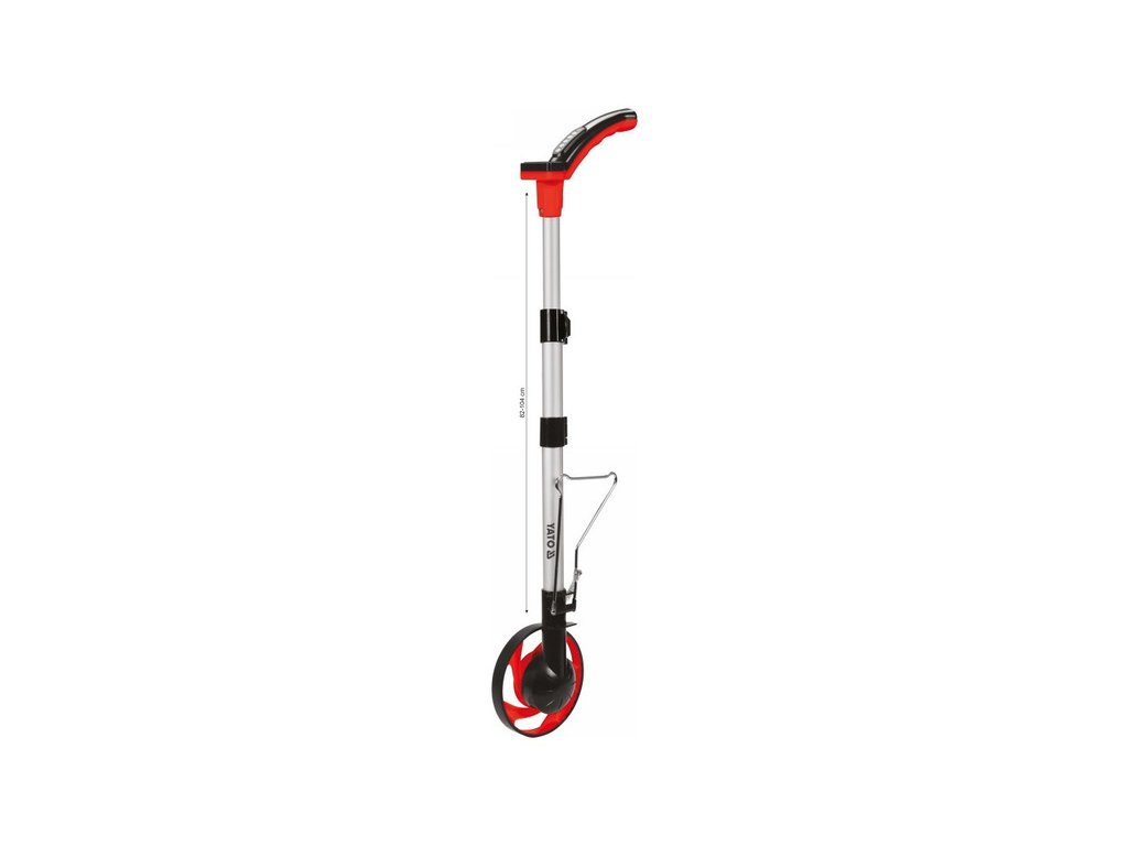 Koliesko na meranie vzdialenosti vhodné pre vnútorné aj vonkajšie použitie, v rozsahu 0,01-10 000 m, s priemerom kolieska 160 mm, LCD displej napájaný 2x1,5 V AAA batériami, presnosť ± 0,05 %, teleskopická rukoväť, odolný materiál ABS na mechanické poškodenie s krytom.