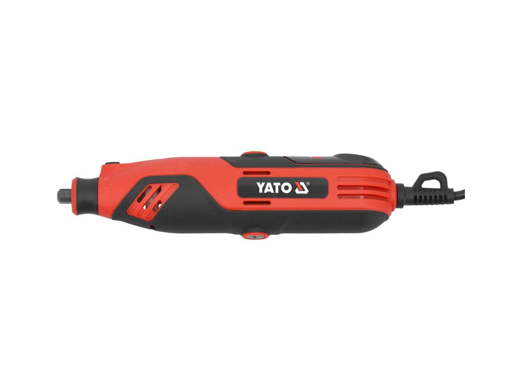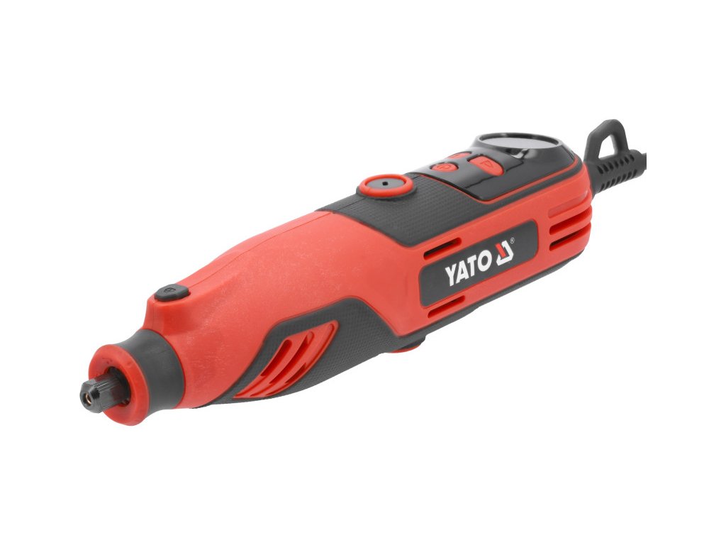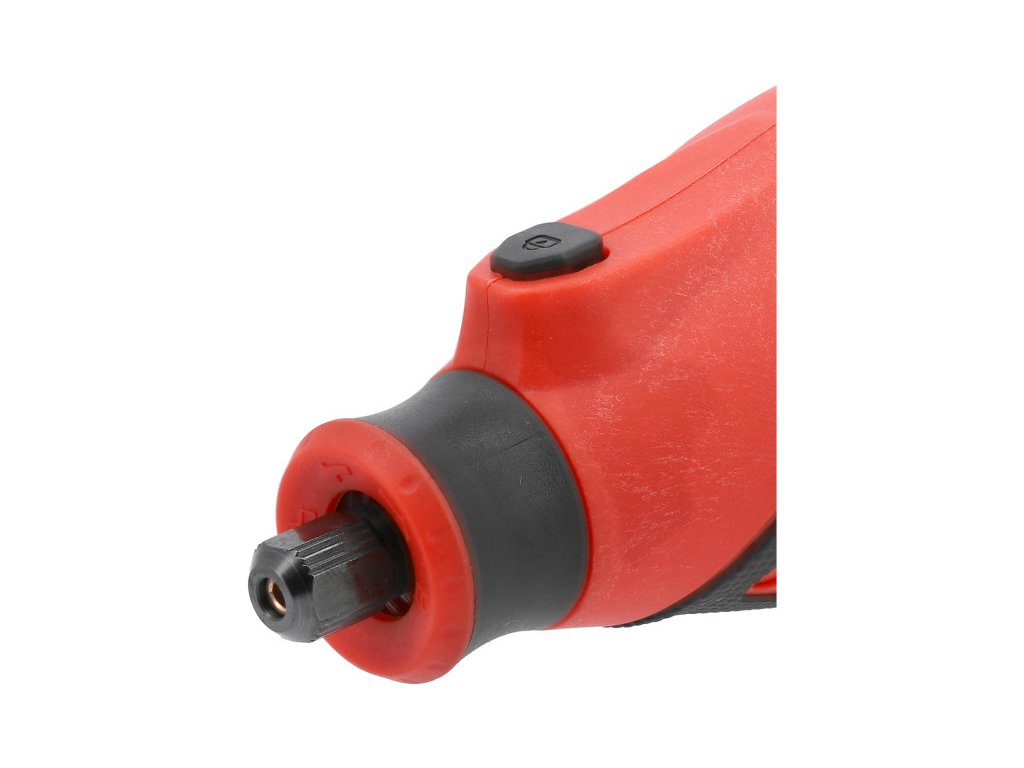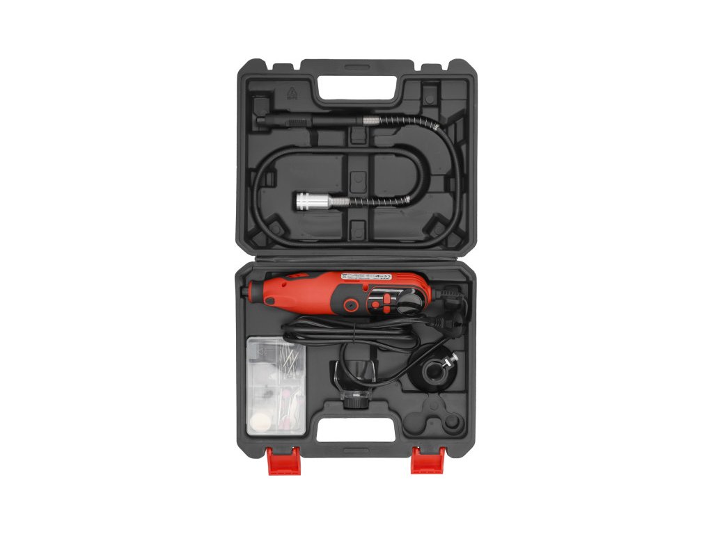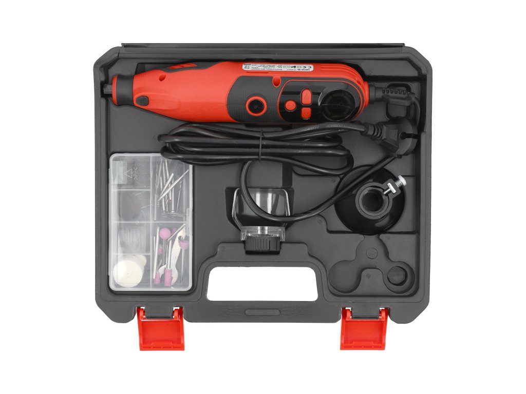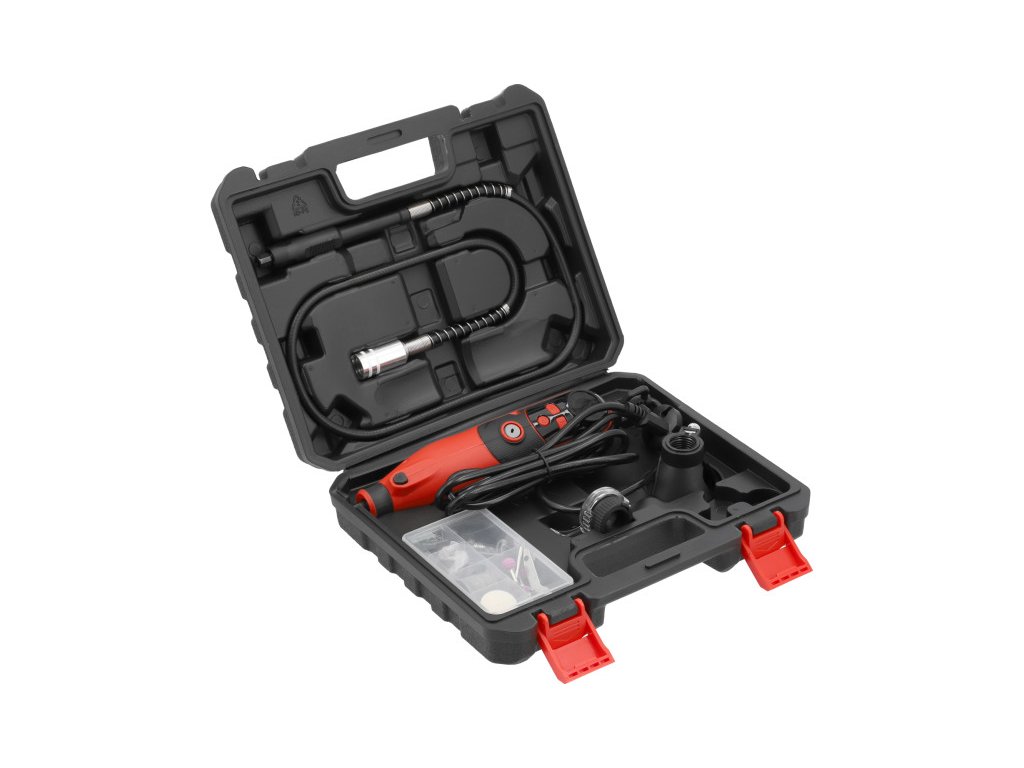 Egy kézreálló hálózati eszköz, amely lehetővé teszi a különféle anyagok precíz megmunkálását. Fúráshoz, csiszoláshoz, maráshoz, gravírozáshoz, polírozáshoz, tisztításhoz használható. Hat sebességfokozattal rendelkezik, 10 000-től 35 000 fordulat/percig, lehetővé téve a sebesség a specifikus feladathoz való igazítását. A sebesség elektronikusan szabályozható. A szerszámtartó öncentírozó. A LED világítás megkönnyíti a precíz feladatok végrehajtását. 130 watt teljesítmény. A mini csiszolóhoz tartozik egy további szerszámtartó rugalmas karja, egy szerszámtartó kulcs, egy védőburkolat, egy karorsó zár, egy marófej és 82 csiszoló tartozék.