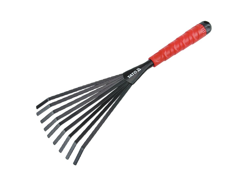 Kis ventilátor gereblye, ideális kis kerti munkákhoz. Különösen hasznos ágyások és virágágyások gondozásánál, beleértve a levelek, gyomok vagy fű gereblyézését. A gereblye munkarésze fém, a nyele műanyag.