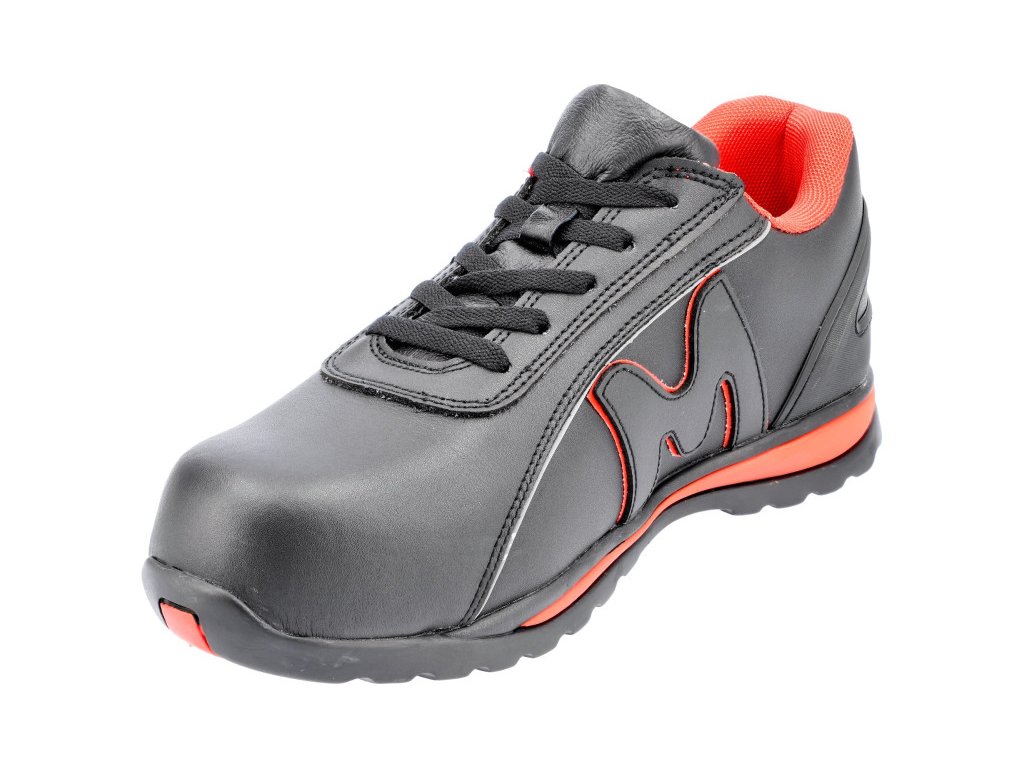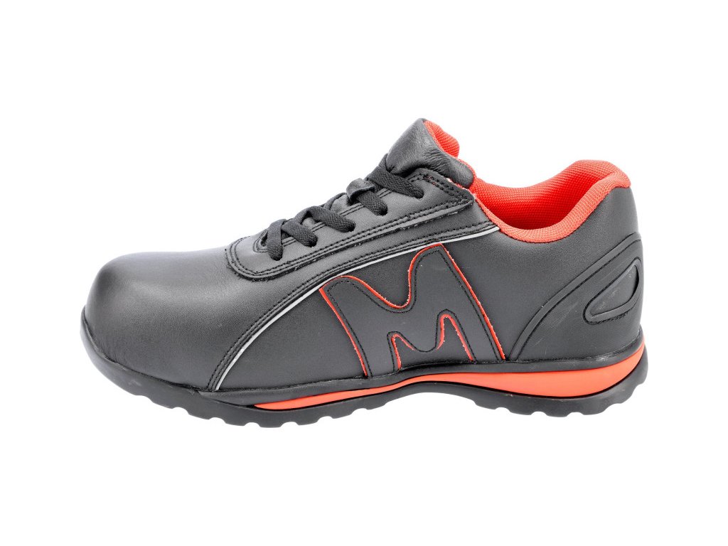A félcipőkban nincs fém. Az átszúrás elleni talpbetét és a gumi talp mind rugalmas, és - a hagyományos PU talppal és acél talpbetéttel ellátott cipőkkel ellentétben - nem korlátozza a láb középső részének hajlítását. A természetes szemcsés bőr felsőrész fényvisszaverő csíkokkal van díszítve, hogy javítsa a viselő láthatóságát.