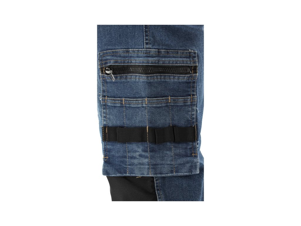 Szerszabó munkanadrág, elasztánt tartalmazó, dörzsölt és rugalmas farmer anyagból készült. Akár tizenhét zseb, köztük egy tépőzáras, két cipzáras és két levehető szerelőzseb. A rengeteg alapzseb és az erős anyagú szerelőzsebek segítenek szervezni az asztalos, tetőfedő vagy vízvezetékszerelő munkáját.
