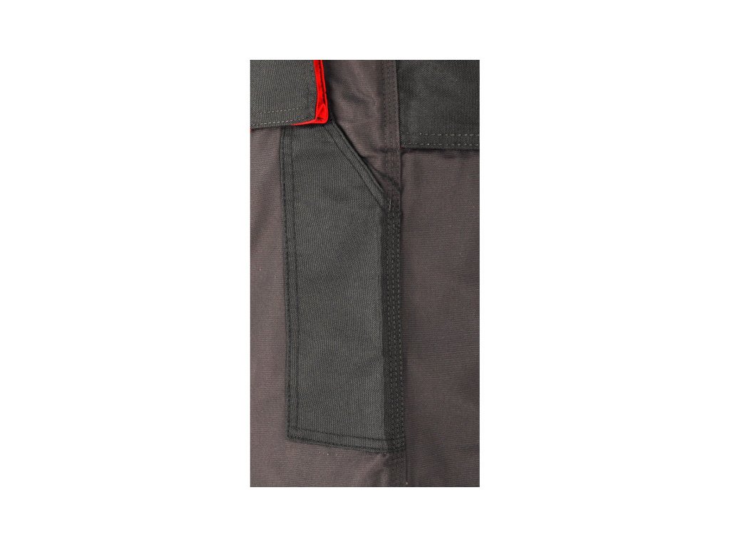 Munkanadrág gallérral, tizenegy zsebbel, köztük hét tépőzáras és speciális zsebekkel a szerszámok számára. Az alapanyag pamut és poliészter keveréke a megfelelő arányban. Ez a megoldás lehetővé teszi a két anyag előnyeinek kihasználását, beleértve a megnövelt szakadási ellenállást és a jó légáteresztést. A leginkább szakadásnak kitett helyeken a anyag összeköttetéseit háromszoros varrással erősítették meg. Alapadatok: anyag: 35% pamut, 65% poliészter súly: 267 g/m² Munkaszervezet: Többfunkciós zseb a mellrészen, beleértve két tépőzárral rögzített zsebet és egy kisebb zsebet kis tárgyak számára az öv alatt az elején többfunkciós zsebek, beleértve két fő zsebet és két bevarrt zsebet tépőzárral rögzített anyaggal, amely ellenáll az kopásnak a bal lábon, egy nagy zseb tépőzárral rögzítve a bal lábon bevarrt textil hurok, például kalapács számára a jobb lábon, egy keskeny zseb anyagból, amely ellenáll az kopásnak, például a tapétakés számára a hátulján az öv alatt, két nagy zseb tépőzárral rögzítve, félig - bevonva anyaggal, amely ellenáll az kopásnak az öv előtt az elején szemfüles karabinerhez kulcsokkal a térdnél zsebek kopásálló anyagból őshonos betétekhez, például 74595 További információk: Háromszoros varrások a szakadásnak kitett helyeken, cipzárral rögzített cipzár. Szélesség állítása az övben lévő gombokkal. Bevarrt hangszóró. Bevarrt hangszóró. A hátsó részben a gallér rögzítése tartós anyagból készült háromszög alakban, megfelelnek a (EU) 2016/425 rendelet munka- és kategóriás ruházat követelményeinek.