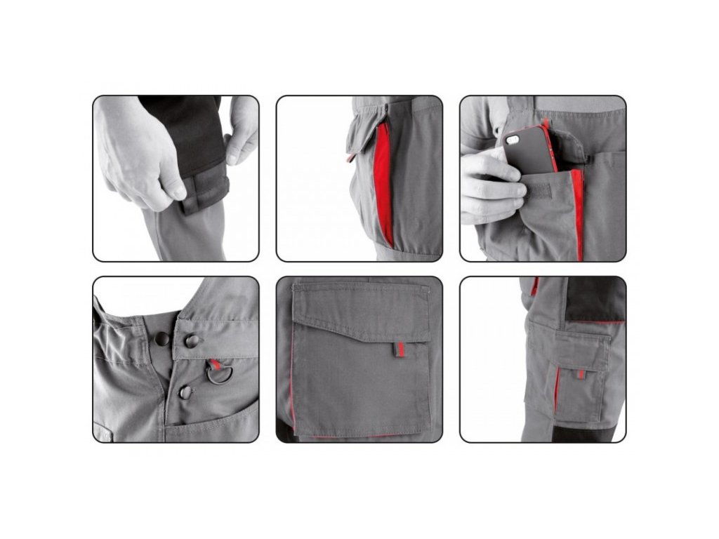 Munkanadrág szalaggal, mint a kertek, hét zsebbel, közöttük öttel tépőzár zárással és speciális zsebekkel tápanyagok számára. A fő anyag a pamut és a poliészter keveréke a megfelelő arányban. Ez a megoldás lehetővé teszi mindkét anyag erősségeinek használatát, beleértve a megnövelt szakítószilárdságot és a jó légáteresztést. Alapadatok: anyag: 35% pamut, 65% poliészter súly: 240 g/m² munkaszervezés: a mellkason két zseb, közül az egyik pályával, tépőzárral rögzített öv alatt elől két zseb anyagból, amely megerősített kopásállósággal rendelkezik a bal lábon egy nagy zseb, tépőzárral rögzített fedéllel az öv alatt hátul két nagy zseb, tépőzárral rögzített fedéllel, megerősített kopásállóságú anyagból az előlapon karabiner szem, beültetett napkhatolánár, pl. 74595 További információk: dupla varrás a szakadásnak kitett helyeken, cipzárral rögzített cipzárral, a derékszélesség beállítása gombokkal az övben, bevarrt -ban gumi összehúzó munkanadrág szalaggal, rugalmas szalaggal a hátulján, erős rögzítővel a hosszúság beállításával a szalagok megfelelnek a (EU) 2016/425 rendelet követelményeinek a munkaruházat és a kategória tekintetében.