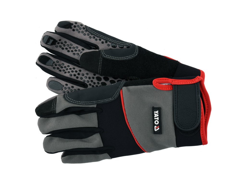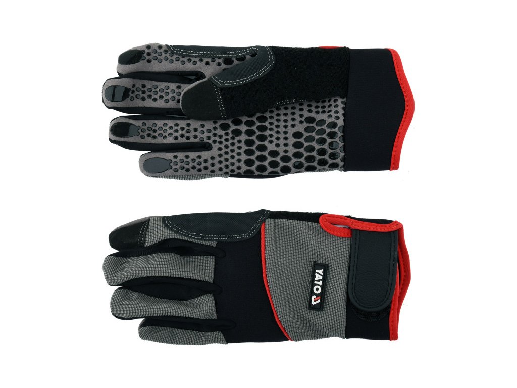 Munkavédelmi kesztyűk, melyeket további megerősítésekkel és szilikon csúszásgátlóval láttunk el a fogási részen, ami megkönnyíti a tárgyak tartását és csökkenti az eszközök csúszásának lehetőségét. Kéziszerszámokkal, elektromos szerszámokkal történő munkavégzéshez vagy áruk szállításához ajánlott. Szintetikus bőrből, dupla rétegű anyagból készül, spandex és neoprén hozzáadásával. A szintetikus bőr a további megerősítésekkel és a fogó részen lévő szilikon segítségével garantálja a nagy szilárdságot, a jó kézilleszkedést és mindenekelőtt megerősíti a fogást. A neoprén a bokán nyúlik és a kéz hajlásával működik együtt. & Nbsp; a hüvelykujjon frottír anyag az izzadság letörlésére. A felső részben két rétegű, tartós nylonból készült anyag hozzáadott műanyaggal, ami rugalmasságot biztosít, nemcsak jó védelmet nyújt a mechanikai veszélyek ellen, hanem magas munkakényelmet is. Fogó rész: Szintetikus bőr külső rész: két rétegű nylon anyag spandex hozzáadásával megerősített összeköttetés a hüvelykujj és a mutatóujj között a hüvelykujjhoz további frottír anyag, pl. az izzadság homlokról történő letörlésére szilikon csúszásgátlóval. Tépőzár.