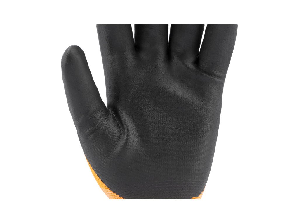 Narancssárga nylonból készült védőkesztyűk, sűrű öltéssel, a markolati részen fekete habosított nitrillal bevonva, különleges adalékanyaggal, amely lehetővé teszi a zökkenőmentes érintőképernyős működést olyan eszközökön, mint a mobiltelefonok és a táblagépek.