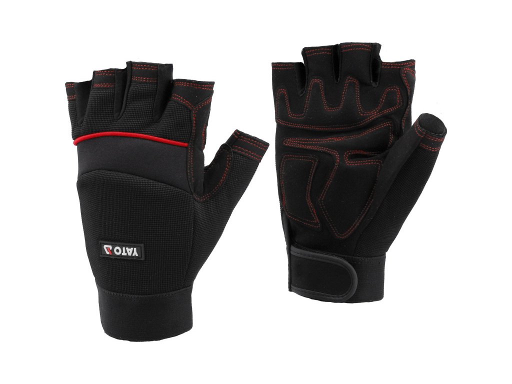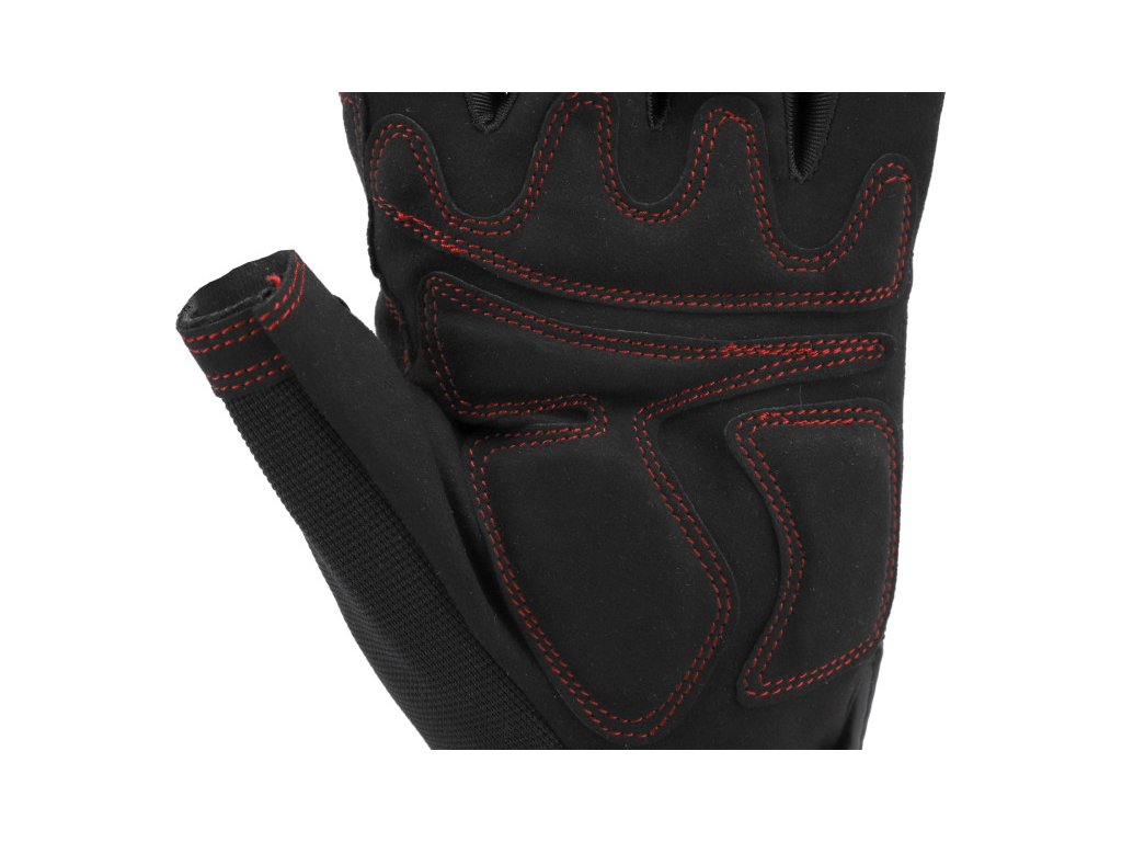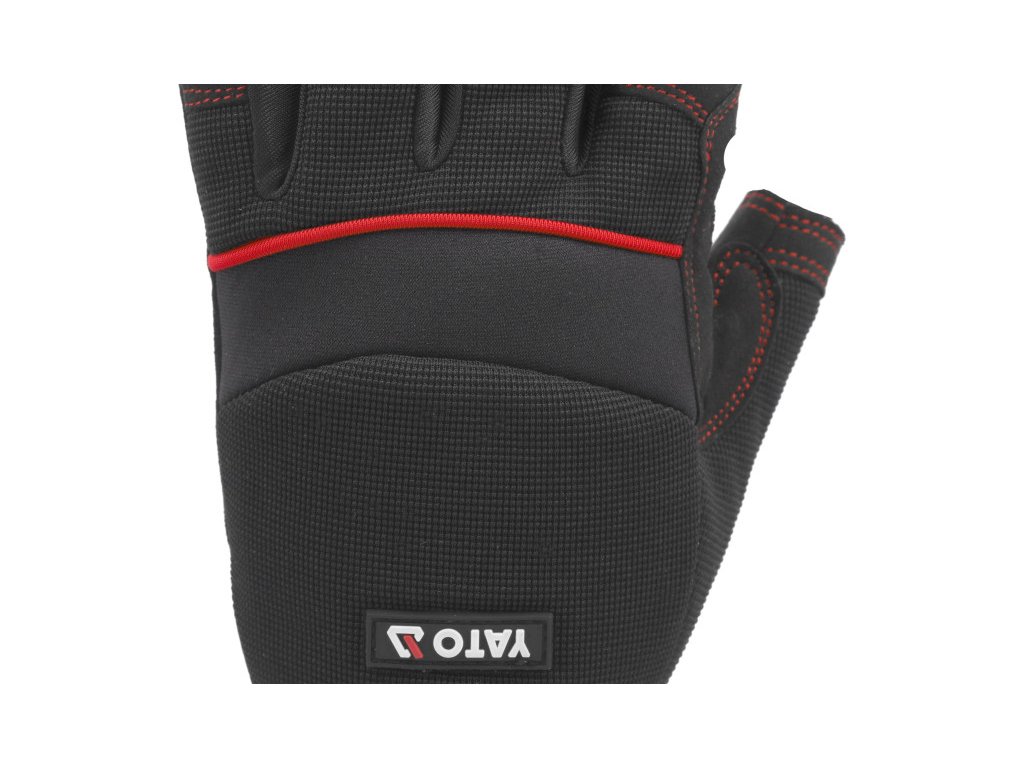 Munkakesztyűk extra megerősítésekkel a magas ujjbegyügyességet igénylő munkához, valamint sportolóknak és kerékpáros utazás szerelmeseinek. Szintetikus bőrből készült, dupla rétegű anyaggal, spandex és neoprén hozzáadásával. A szintetikus bőr további megerősítésekkel a fogó részen garantálja a nagy szilárdságot és a jó illeszkedést a kezekhez. Párnák védik a nyomtatások kialakulása ellen. A neoprén a bokákon nyúlik és a kéz hajlításával működik. A felső részben két rétegű anyagból készült, tartós nylonból, műanyag hozzáadásával, ami rugalmasságot ad neki, nemcsak jó védelem a mechanikai veszélyek ellen, hanem a munka magas kényelme is. Öntőrész: Szintetikus bőr külső rész: két rétegű nylon anyag spandex párnával, amely véd a lenyomatok ellen a fogó részen az ujjak és a kezek alapjánál Az erősített kapcsolat az hüvelykujj és a mutatóujj között a helyén a kockák rugalmas neoprén gumírozott mandzsettával, tépőzáras csat