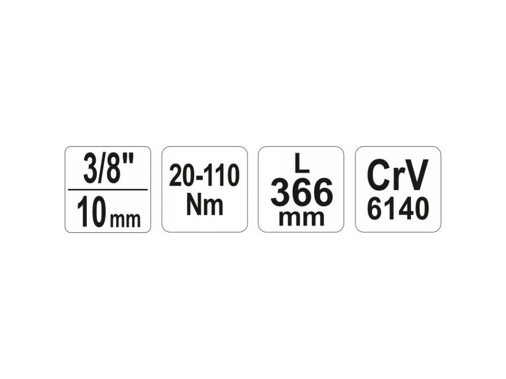 • upínanie: 3/8 palca • krútiaci moment: 20-110 Nm • dĺžka: 342-360 mm • presnosť: +/- 4 % • materiál: CrV 6140 oceľ
