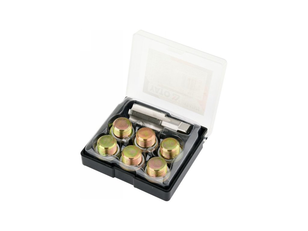 Olajteknő leeresztő dugó menetének egyszerű javítására szolgáló készlet, sebességváltókhoz stb. A legtöbb, személyautókon és kisteherautókon gyakran használt menettípusra illeszkedik.