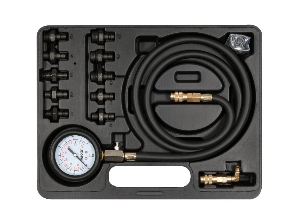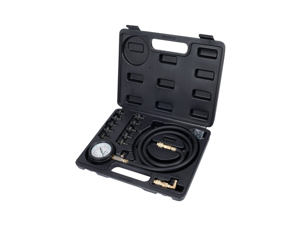 Professzionális olajnyomásmérő. A készlet 10 csökkentőt tartalmaz, így a mérő a legtöbb motorral kompatibilis. A nyomásmérő házát további gumi borítás védi.