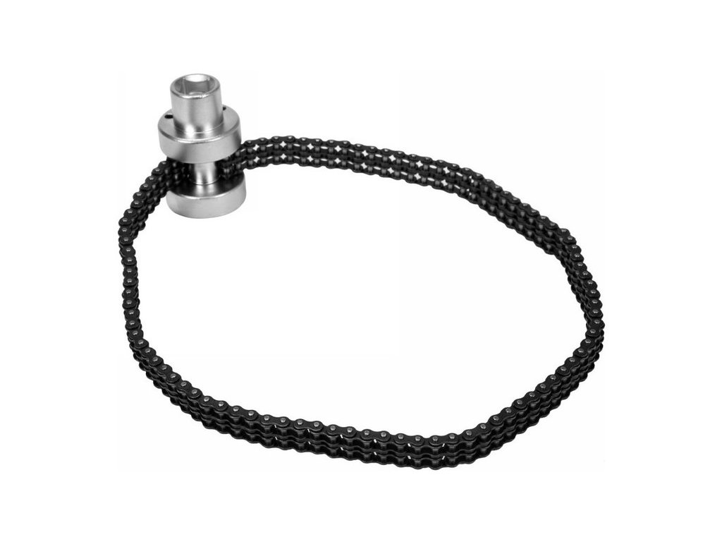 Dupla lánc kulcs, acél olajszűrőkhöz, 75-től 170 mm átmérőig. Ajánlott mechanikai műhelyeknek és autószervizeknek.