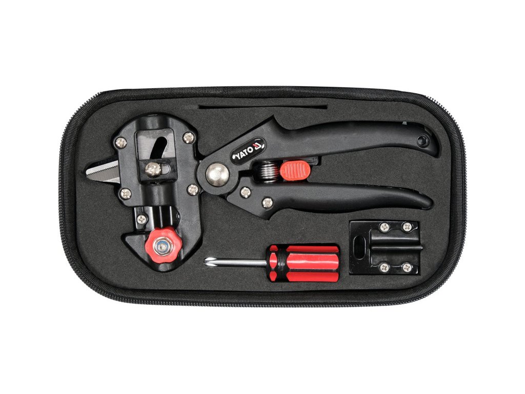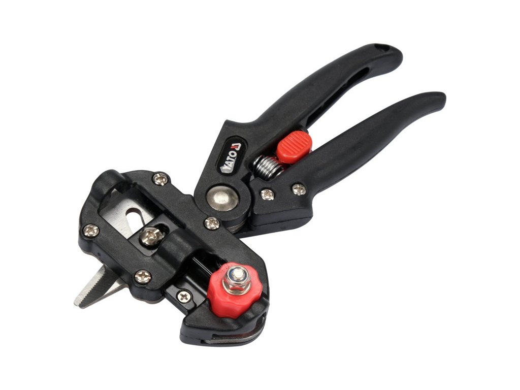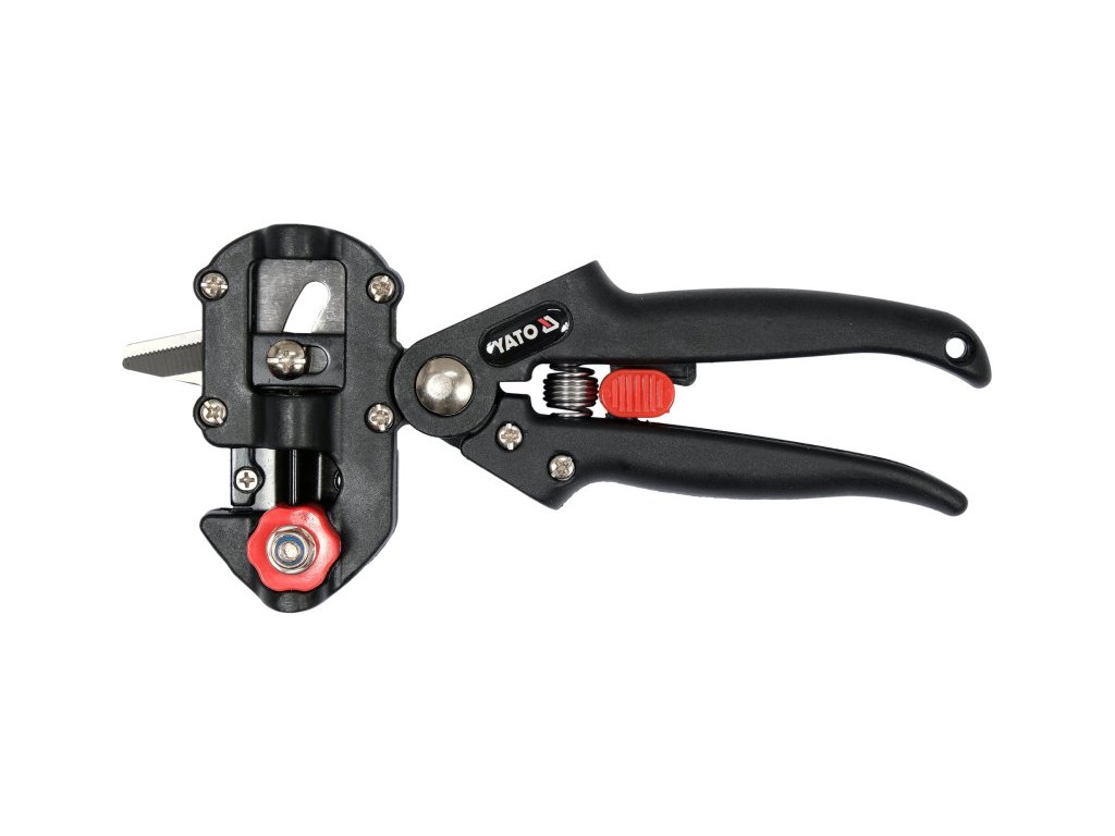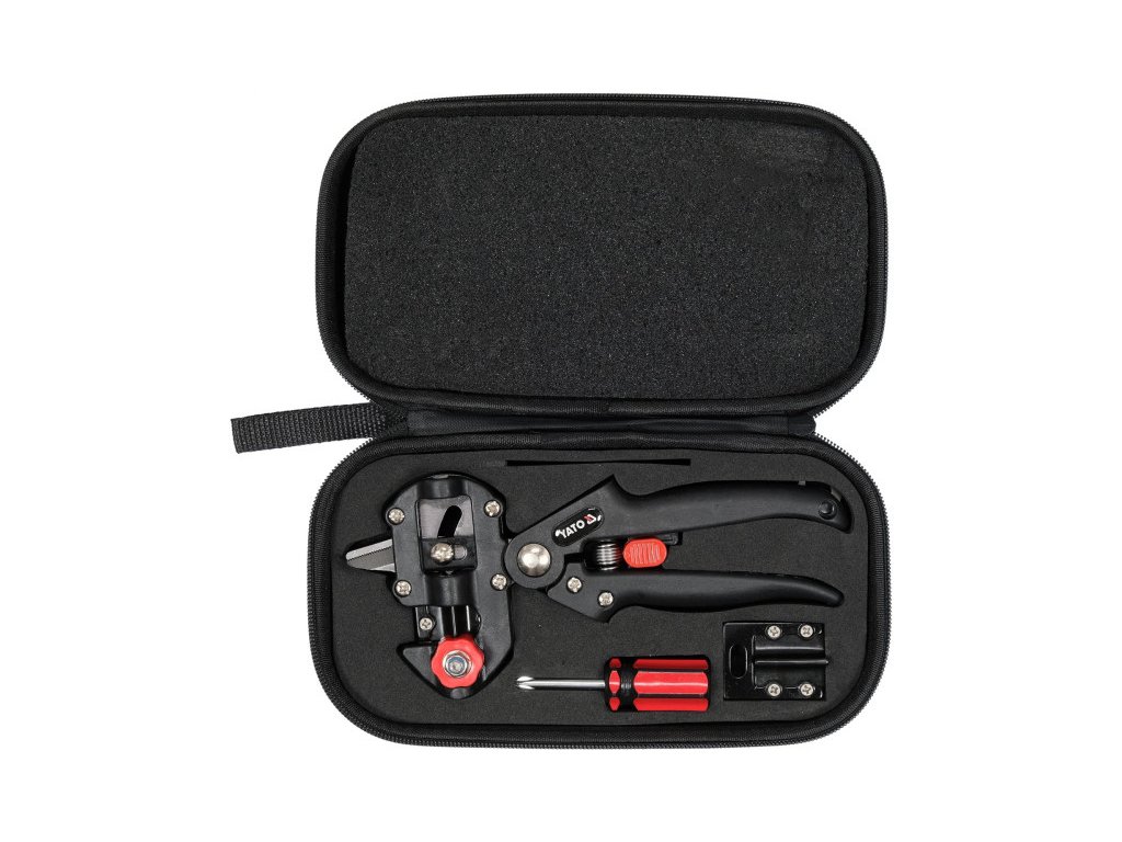 Prerezávacie nožnice na štepenie stromov, kríkov a viniča a na presné rezy Kvalitná čepeľ umožňuje hladký povrch rezu Zaisťovací mechanizmus čepele zaručuje bezpečnosť počas prevádzky Ergonomická rukoväť zaisťuje pohodlné používanie Nožnice s príslušenstvom sú umiestnené v odolnom kufríku.