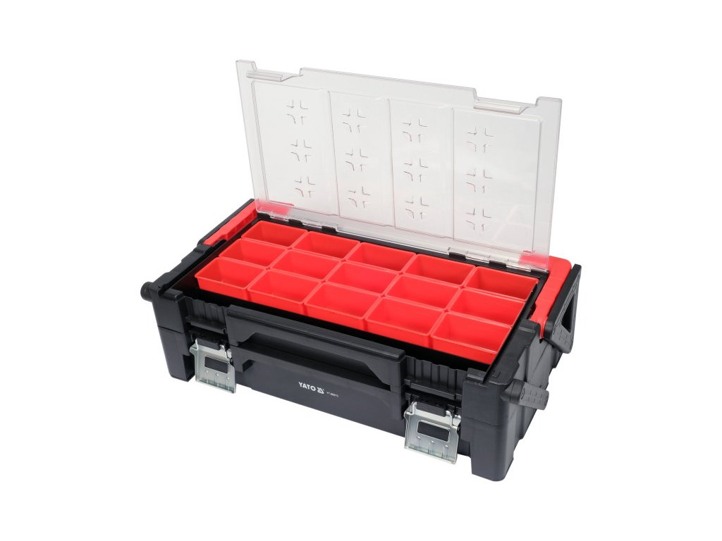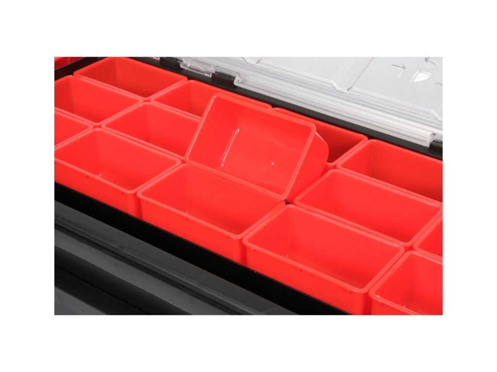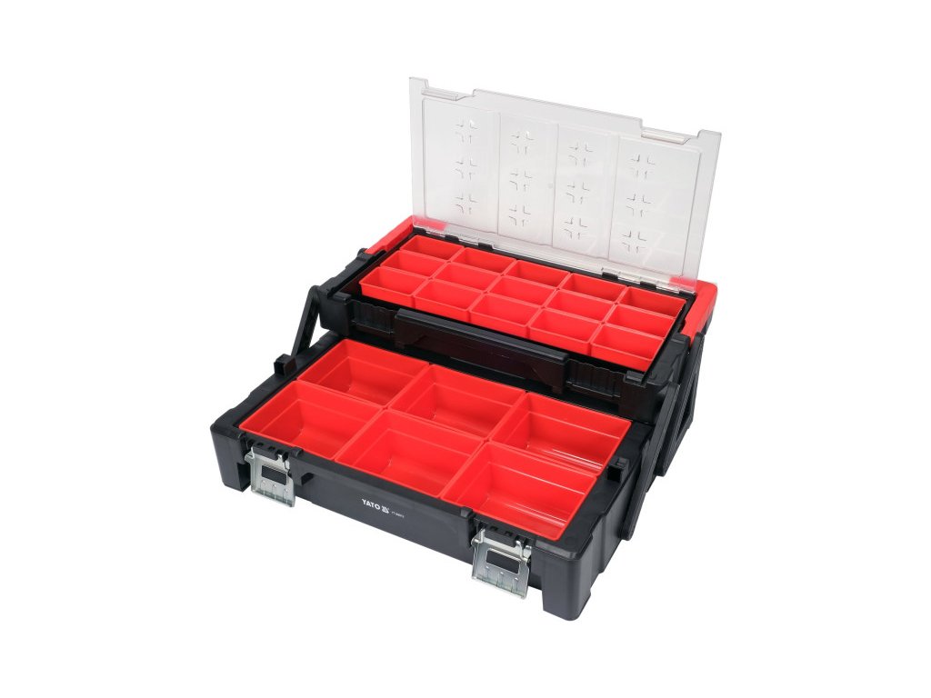 Összecsukható, kétszintes rendező apró munkaeszközök tárolásához, melyre szüksége lehet a műhelyben és a garázsban.