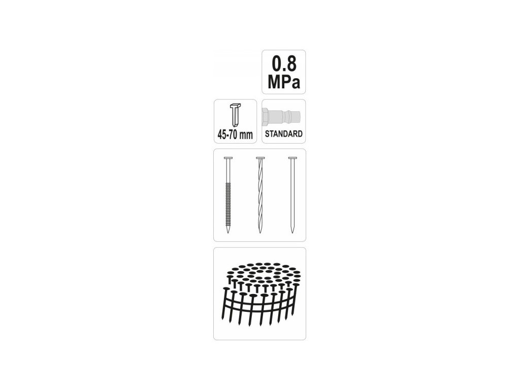 Professzionális dobos szegezőgép, 45 és 70 mm hosszú szegekhez, amelyeket 15°-os szögben összekötött drót tart össze. A test öntött magnézium-alapú ötvözetből készült. Forgatható légkifúvó csővel, biztosítóval a véletlen alkalmazás megakadályozására, oldalsó töltőrendszerrel, védővel és porvédővel rendelkezik. ¼ bspt csatlakozás.
