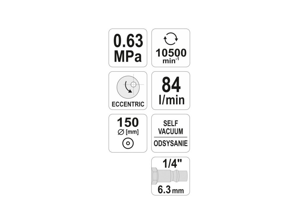 Technické údaje Priemer kotúča 150 mm Excentricita 5 mm Otáčky 10500/min Prevádzkový tlak vzduchu 6,3 bar Spotreba vzduchu 84 l/min Veľkosť prípojky vzduchovej hadice 1/4