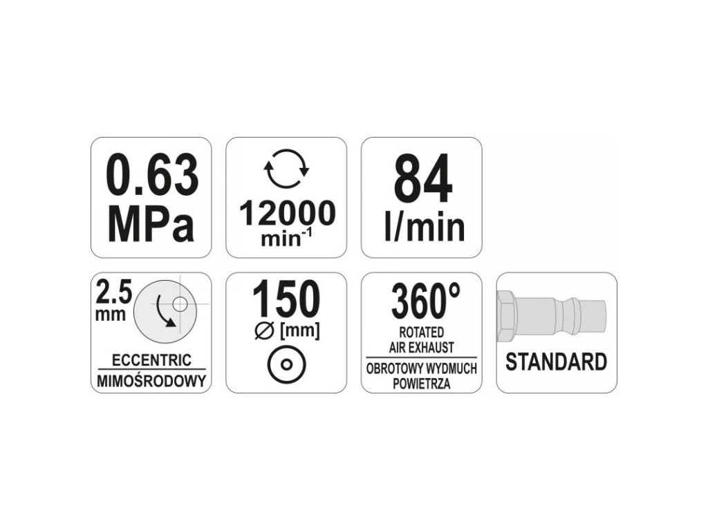 Technické údaje Priemer kotúča 150 mm Prevádzkový tlak vzduchu 6,2 bar RPM 12000/min Spotreba vzduchu 82 l/min