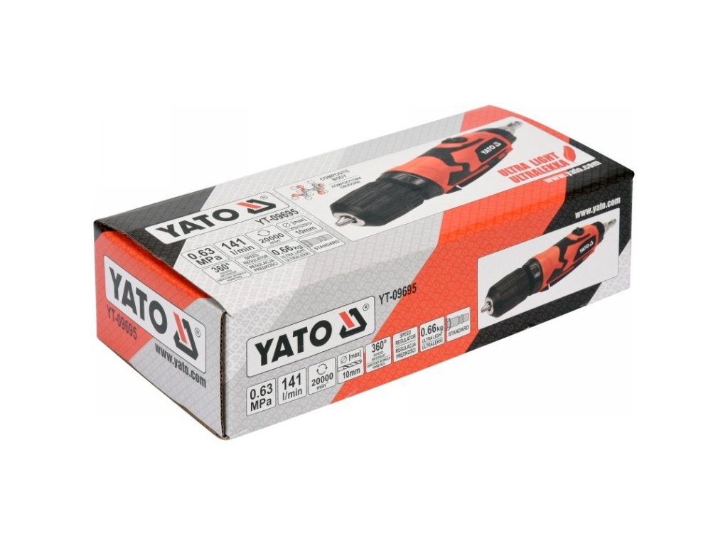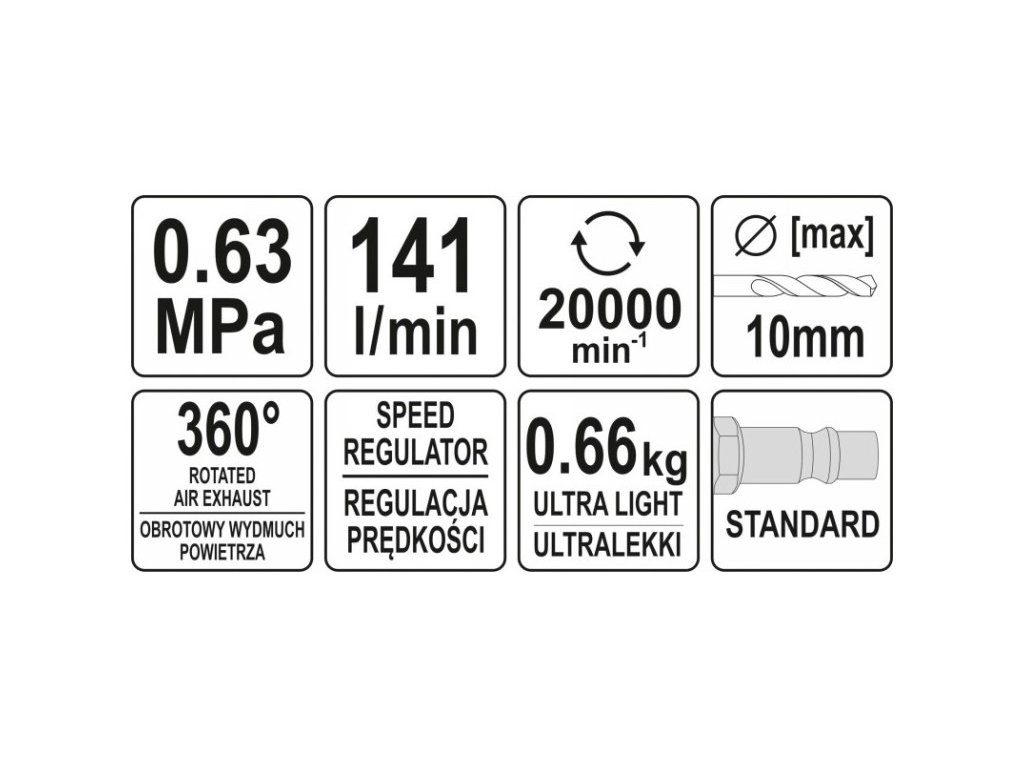 Technické údaje Hmotnosť 0,66 kg Veľkosť skľučovadla 10 mm Prevádzkový tlak vzduchu 6,3 bar RPM 20000/min Spotreba vzduchu 141 l/min